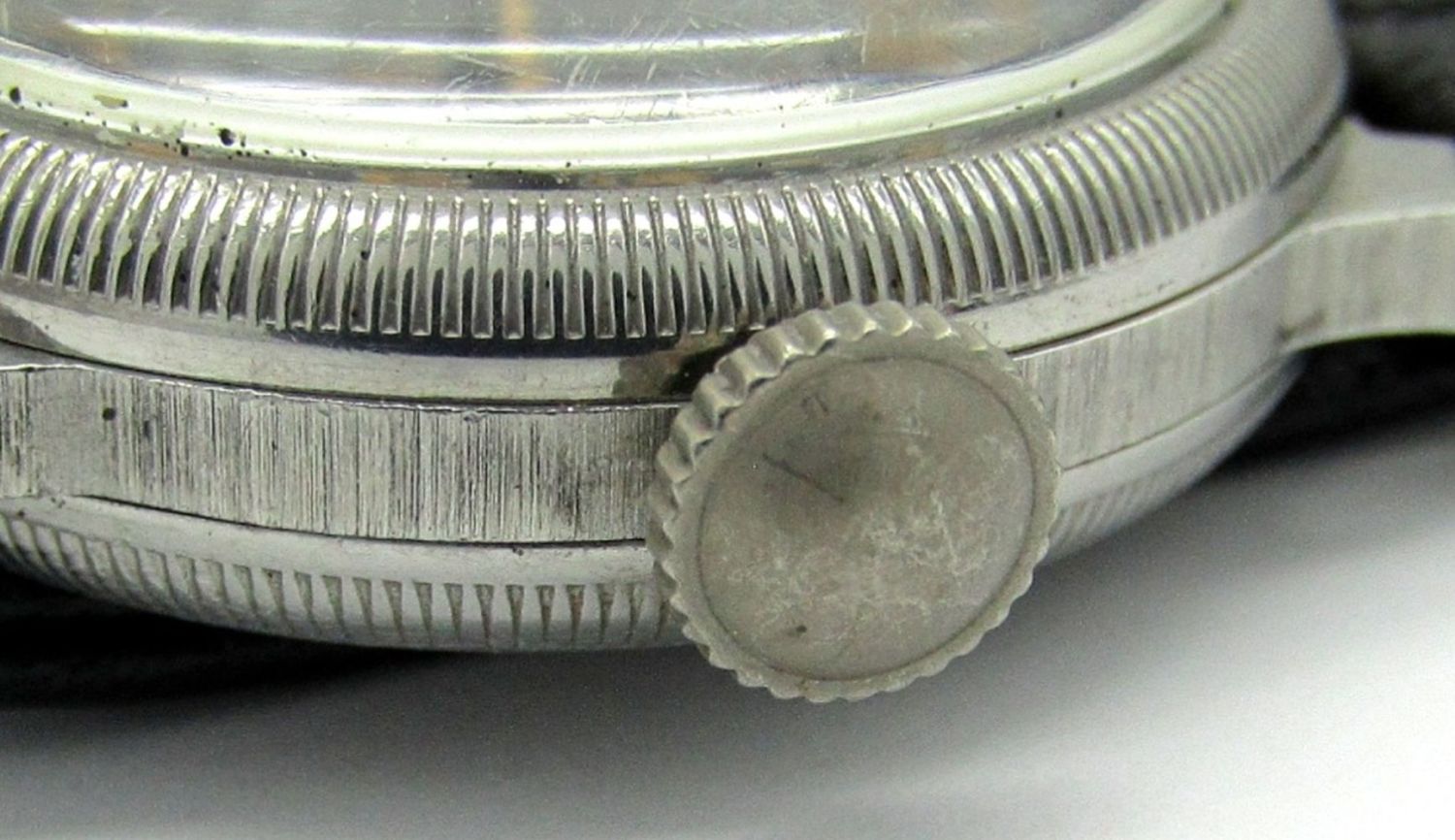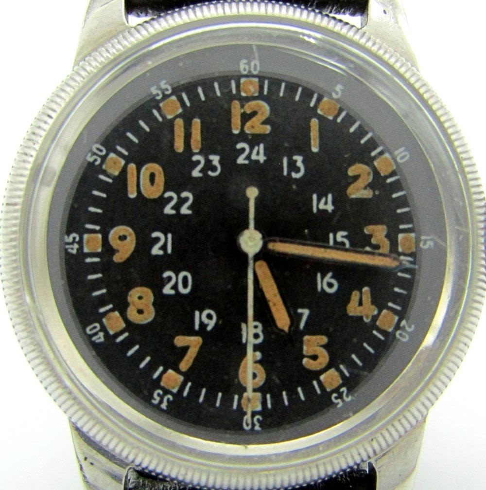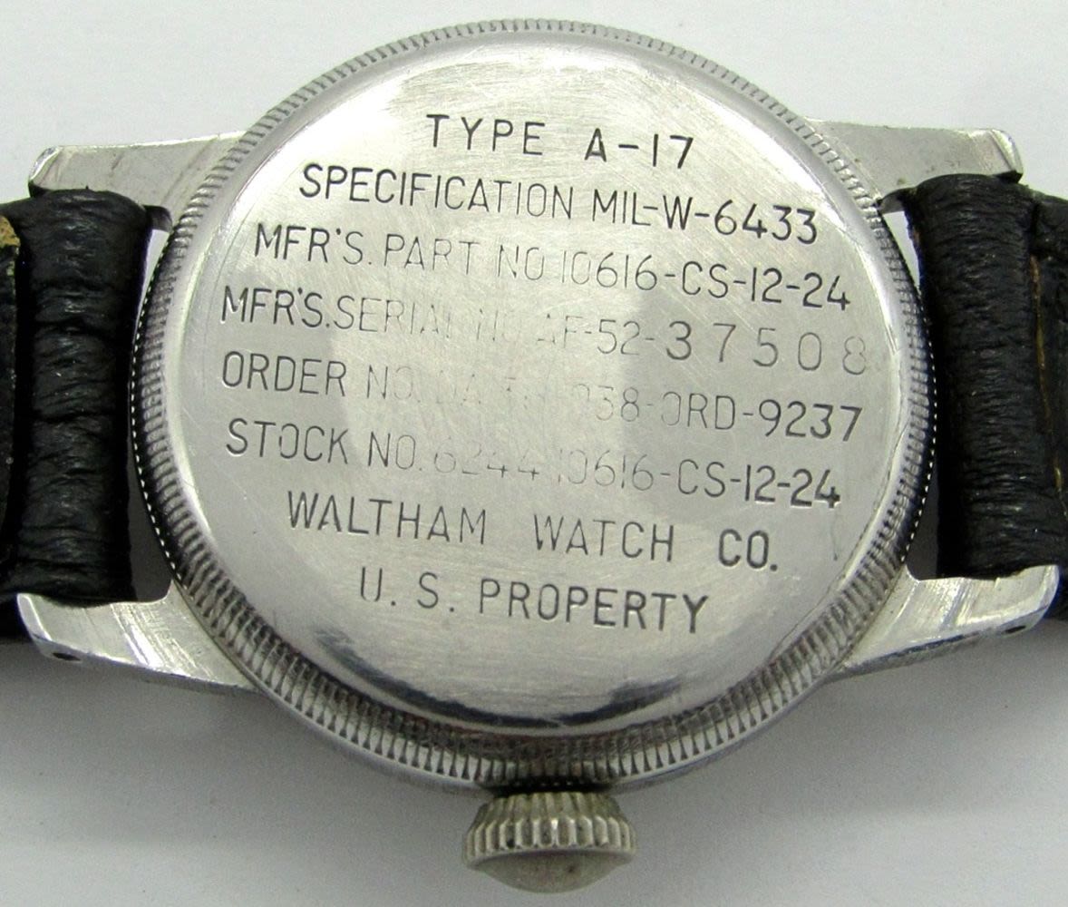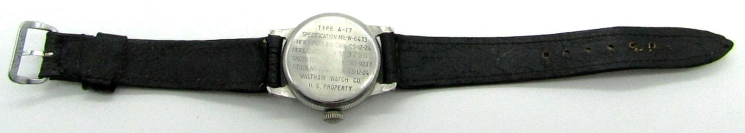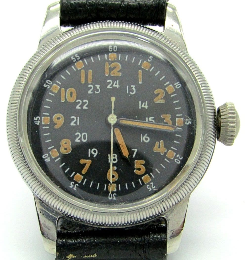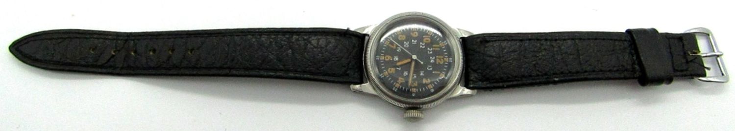 Perfect Original Black Dial With 24-Hour Markers, Base Metal Screwback Case with Nomenclature on Back (Partially Rubbed), 17 Jewel Hacking Movement, 31mm, Circ 1950’s.