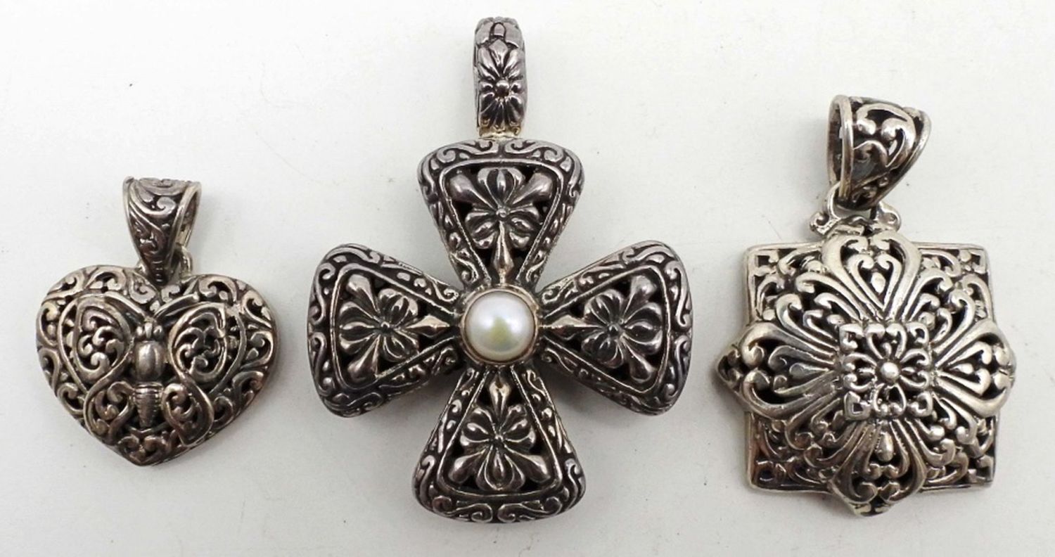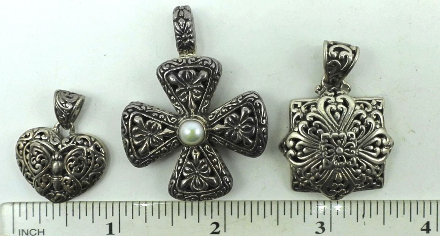 21DWT, 1-CROSS WITH A FAUX PEARL IN THE MIDDLE FLOWER DESIGN, 2IN LENGTH, 1- HEART WITH A BUTTERFLY IN THE MIDDLE, UNDER 1IN LENGTH, SQUARE DESIGN ABOUT 1 1/2IN LENGTH, ALL STAMPED ON THE BACK 925