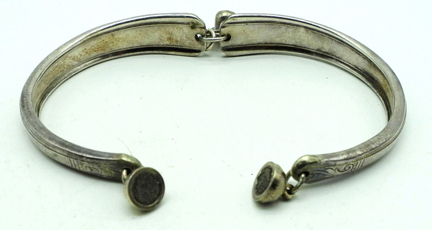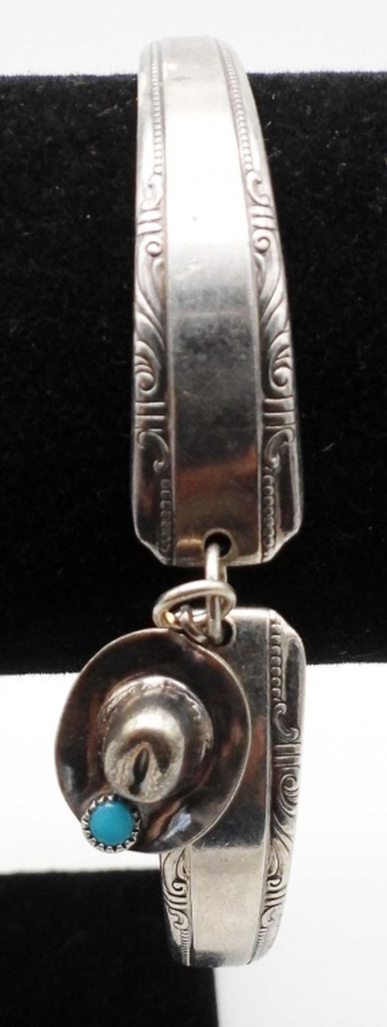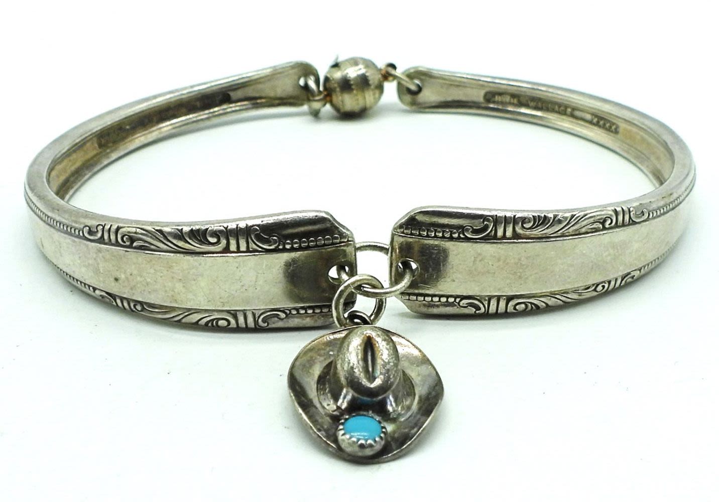 22.3DWT, MAGNET CLASP, COWBOY CHARM DANGLES AND HAS A TURQUOISE BEAD ON IT, STAMPED WALLACE ON INSIDE