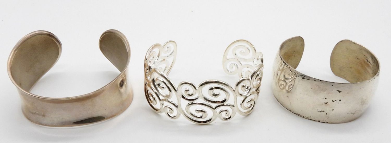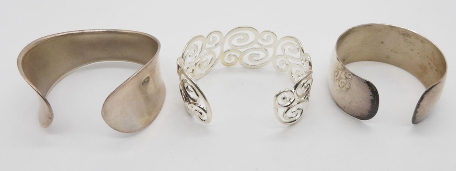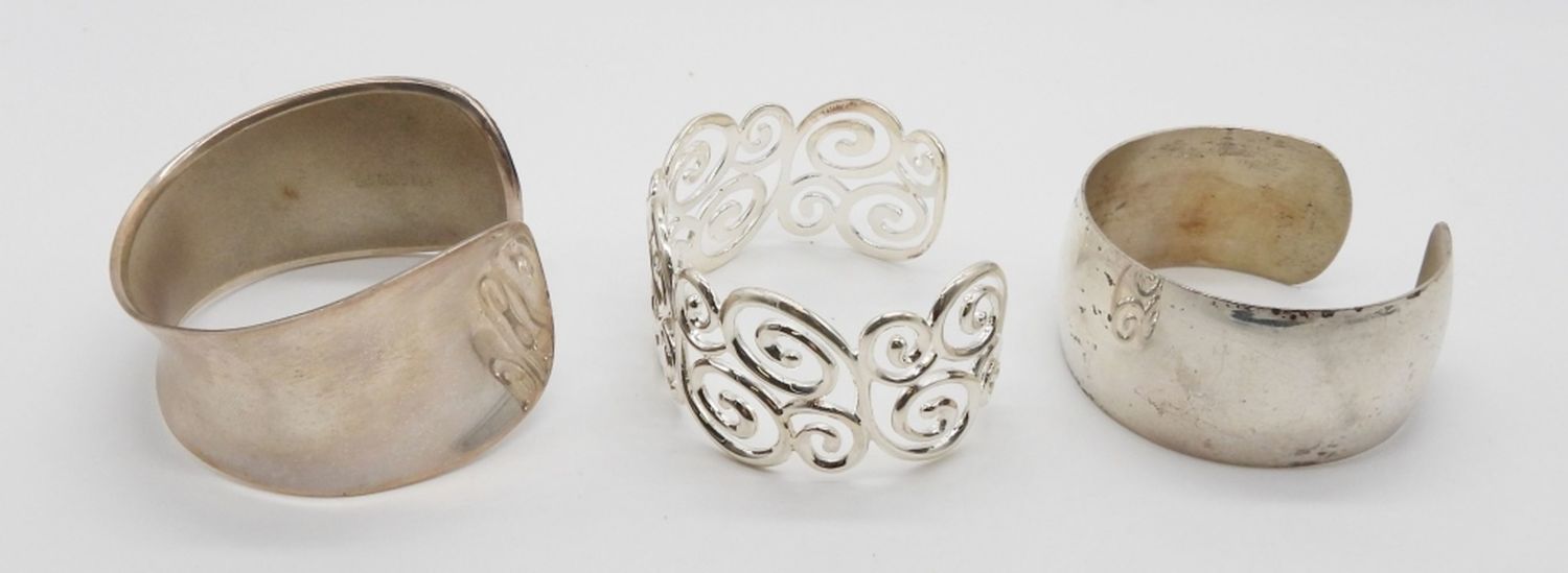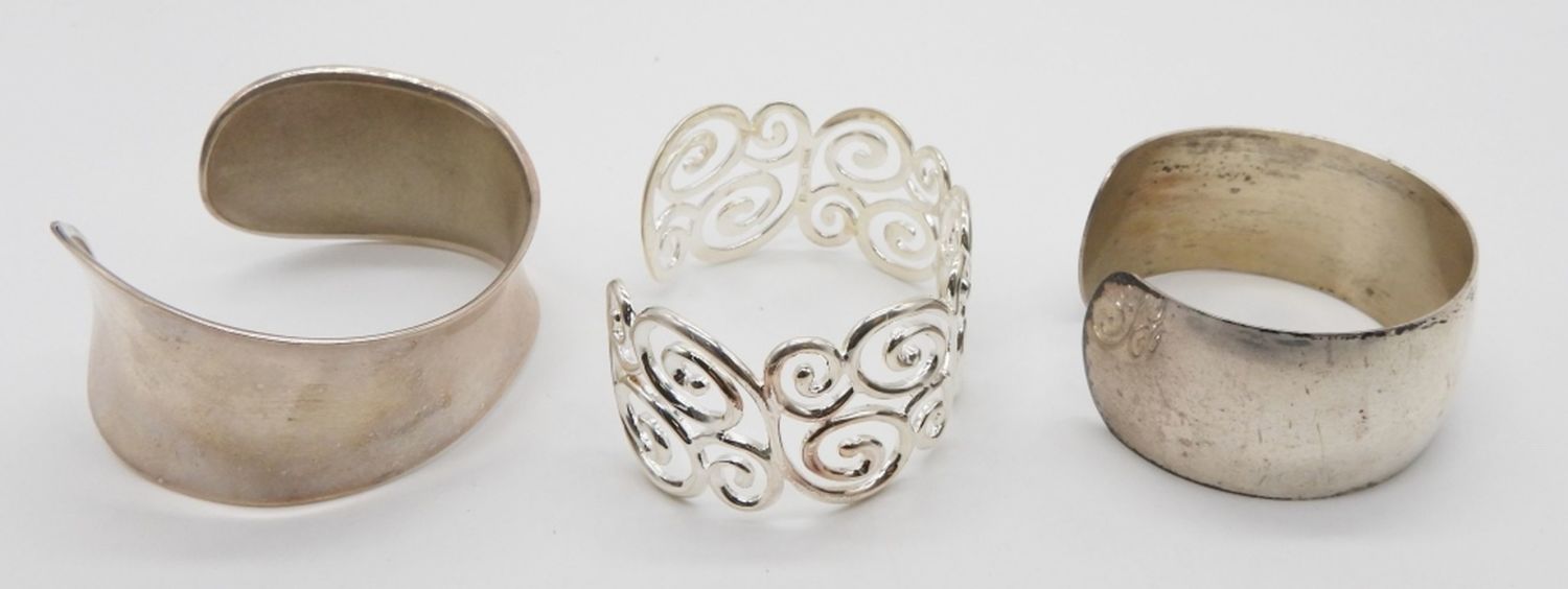 65.8 DWT; (3) STERLING SILVER CUFF STYLE BRACELETS; PLAIN AND SWIRL DESIGN; MARKED STERLING 925
