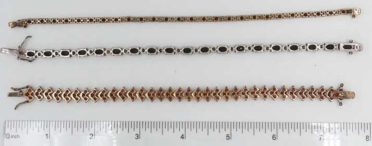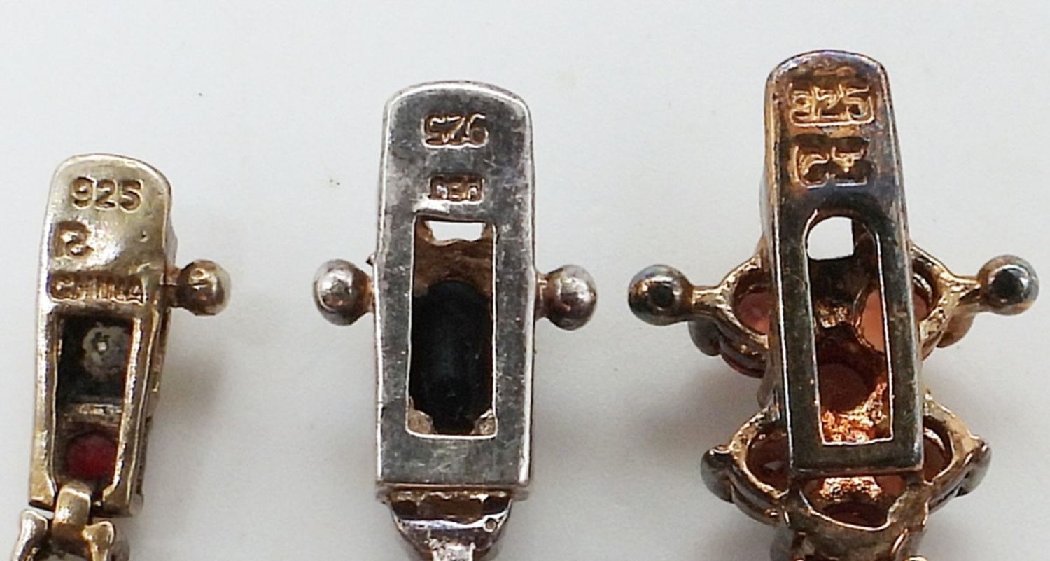 28.7DWT, BETWEEN 7 1/2 AND 8 IN LONG, ALL STAMPED WITH 925 ON THE BACK OF THE OPEN BOX CLASP, ORANGE, BLACK ONYX AND GARNET AND CLEAR STONES