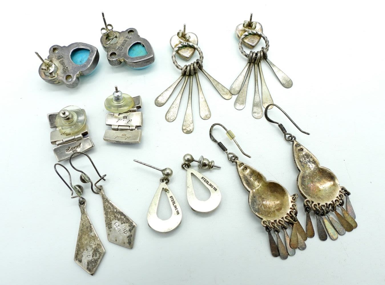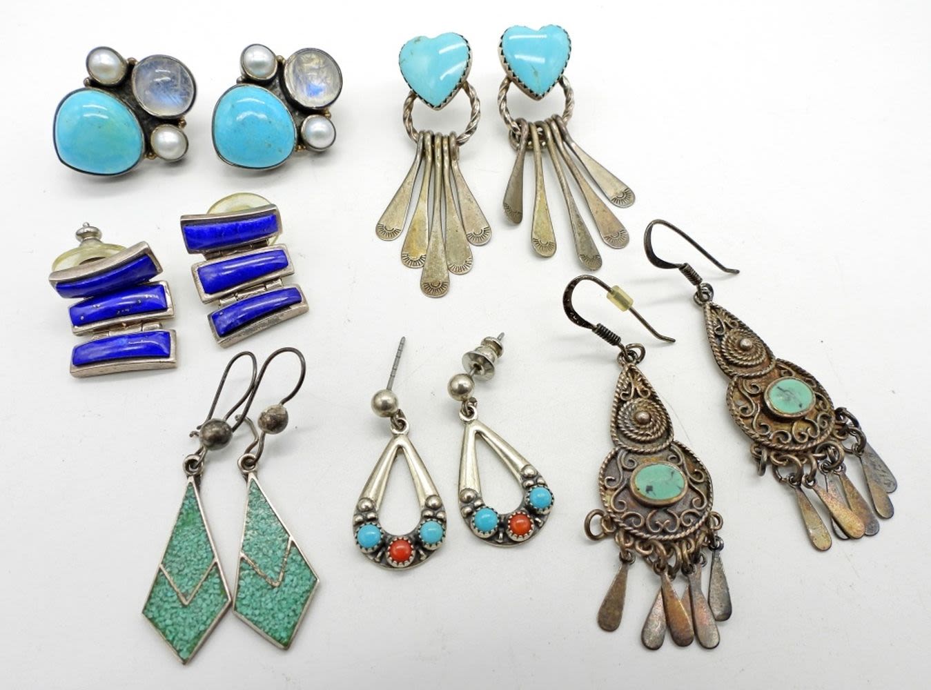 25DWT, TURQUOISE, CORAL, MOONSTONE MAKE UP THESE PIERCED EARRINGS, ALL STAMPED 925, BLUE STONE PAIR ALSO STAMPED SANEL