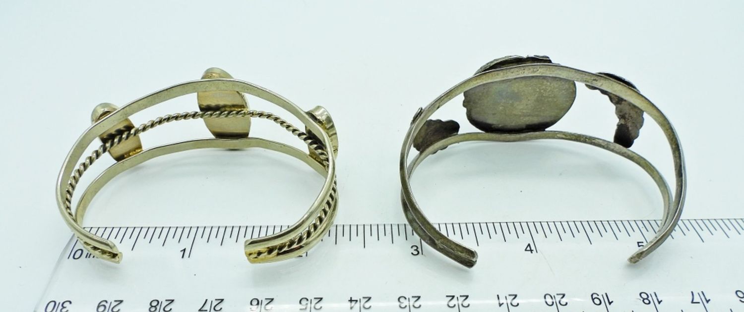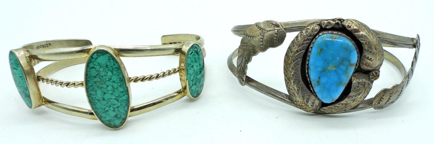 23.3DWT, BOTH 2 1/2IN WIDE, ONE CRUSHED GREEN STONE CUFF STAMPED MEXICO, 1 TURQUOISE WITH LEAF DESIGN CUFF, NO STAMPING FOUND