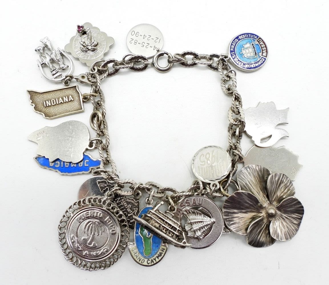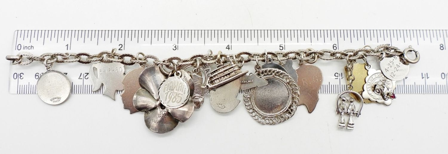30DWT, 7 1/2IN LONG, SPRING CLASP STAMPED 925, 17 CHARMS ALL STAMPED STERLING