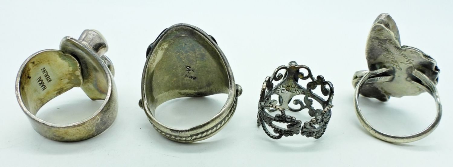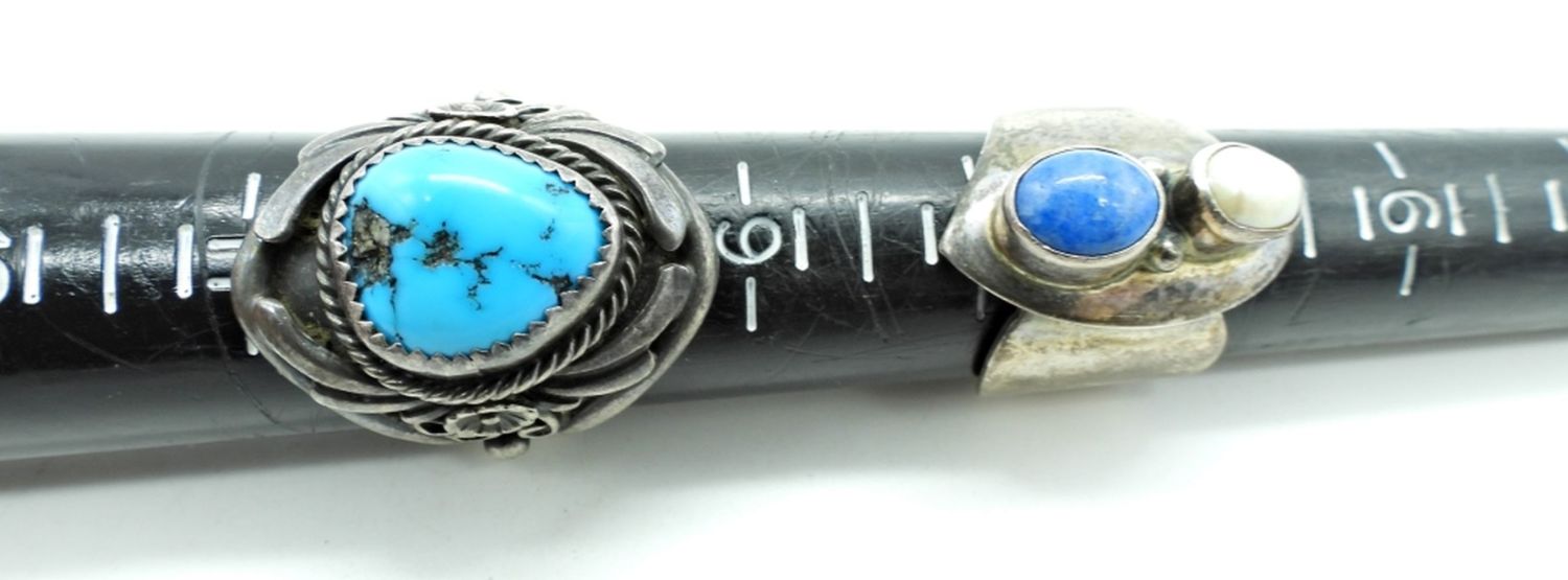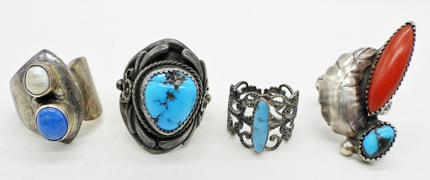 21.6DWT, SIZES: 6-1, 7-2, 10-1, CORAL TURQUOISE ENGRAVED LA CREDA, TURQUOISE STAMPED STERLING SC, BLUE AND MOTHER OF PEARL RIGN STAMPED NAKAI STERLING