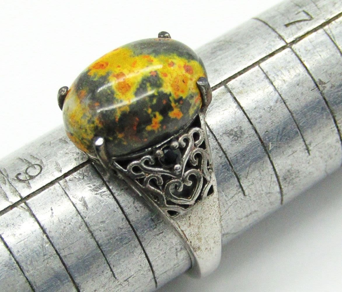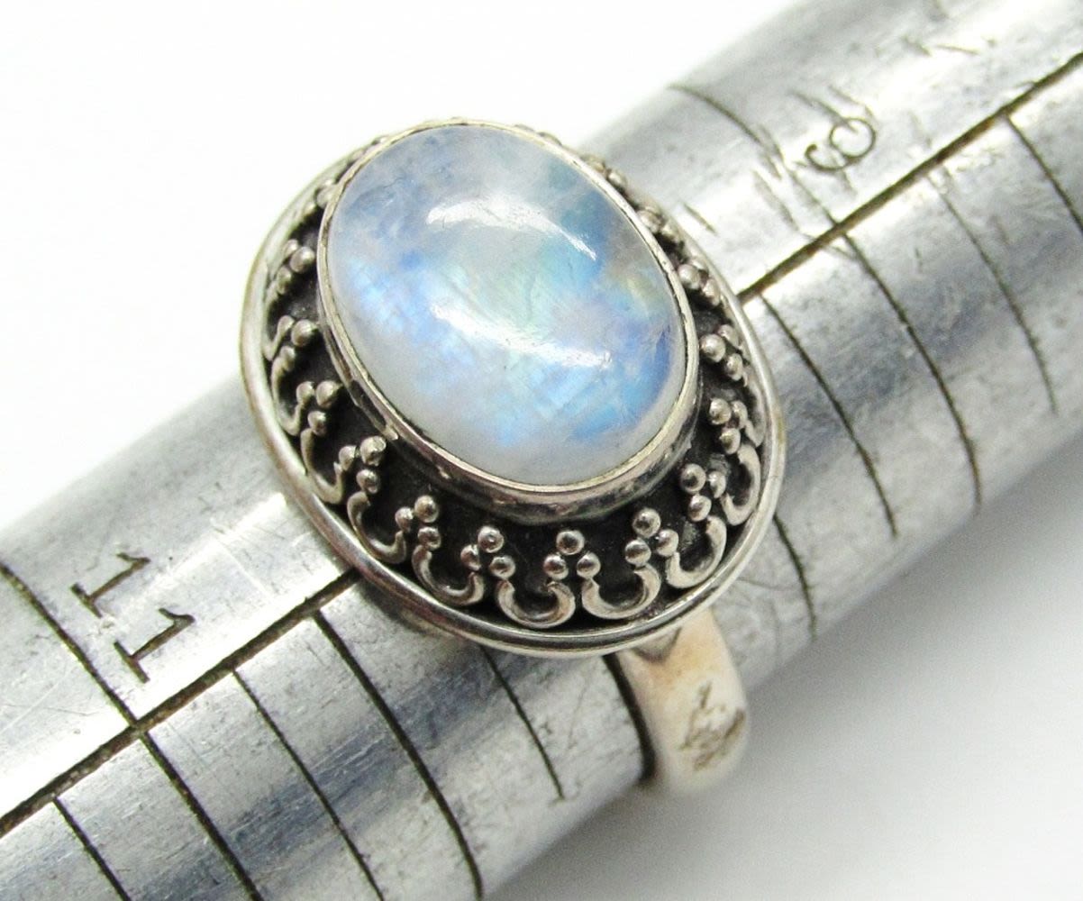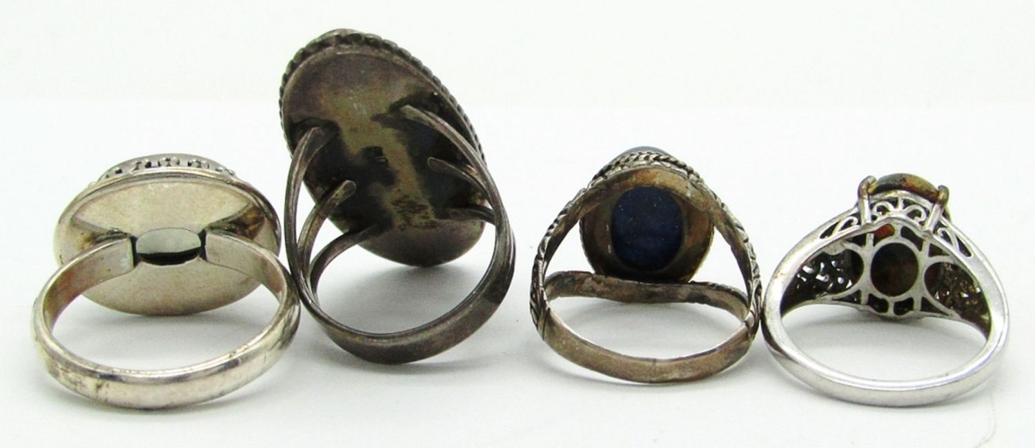 Size 10 Moonstone 925 India, Size 8.5 Lapis Lazuli 925, Size 8 Bumblebee Jasper STS 925, Size 7.5 Agate Sterling; 18.4 dwt.