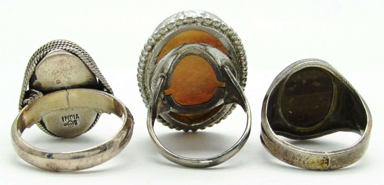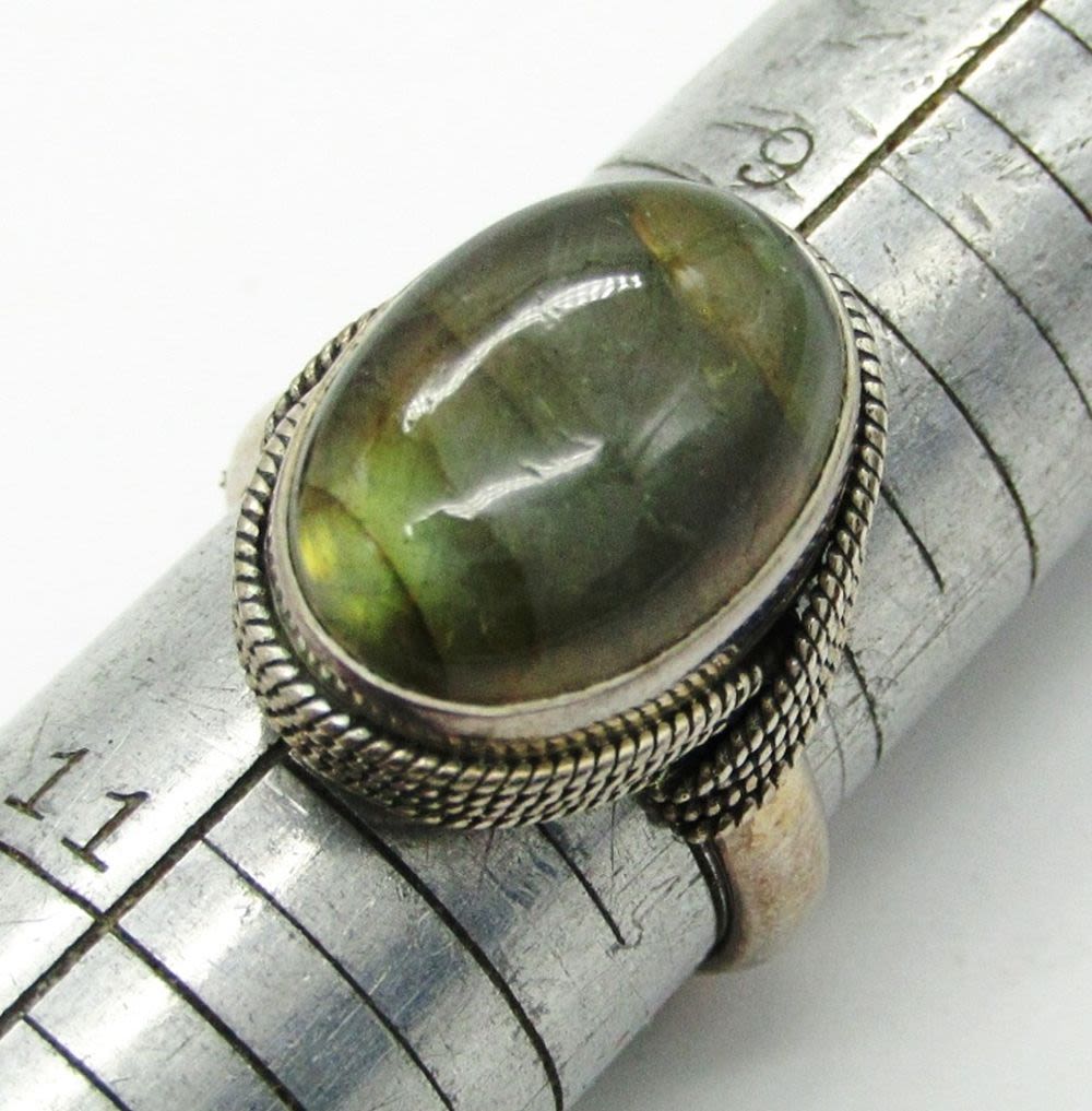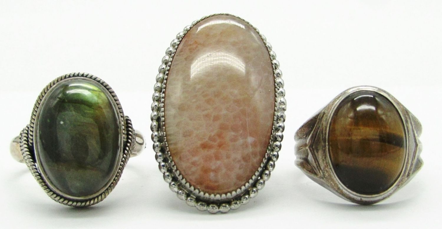 Size 10 Labradorite India 925, Size 8.5 Tigers Eye Sterling G & B, Size 8 Moonstone Sterling LSP Co.; 18 dwt.