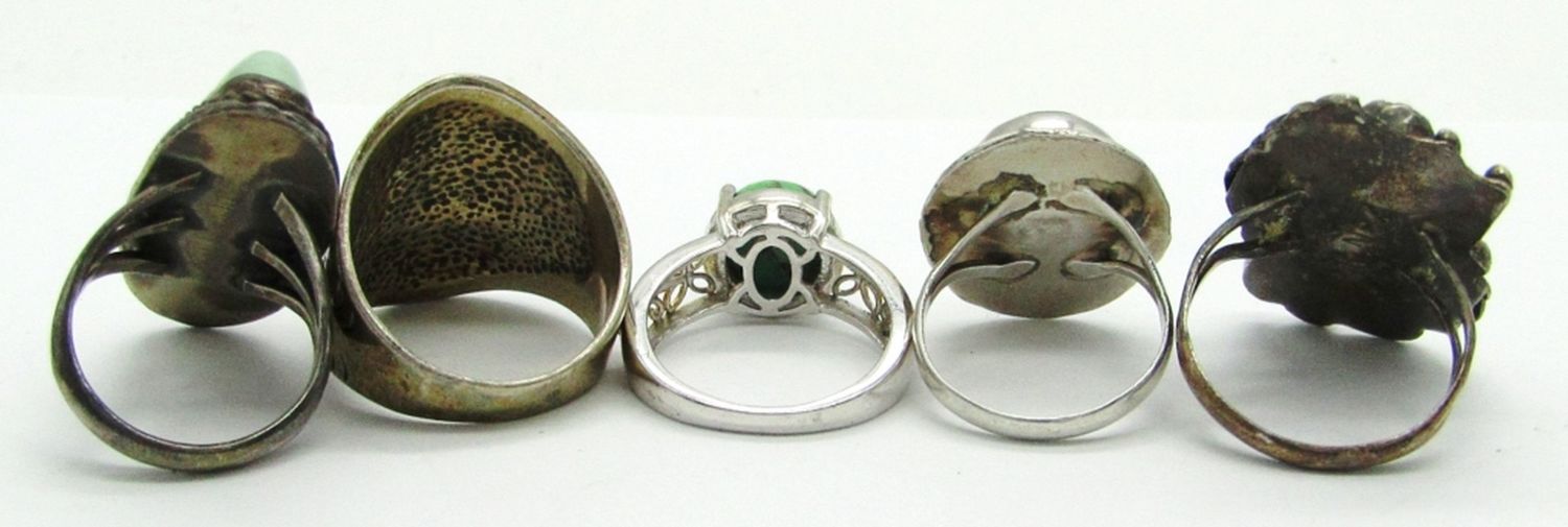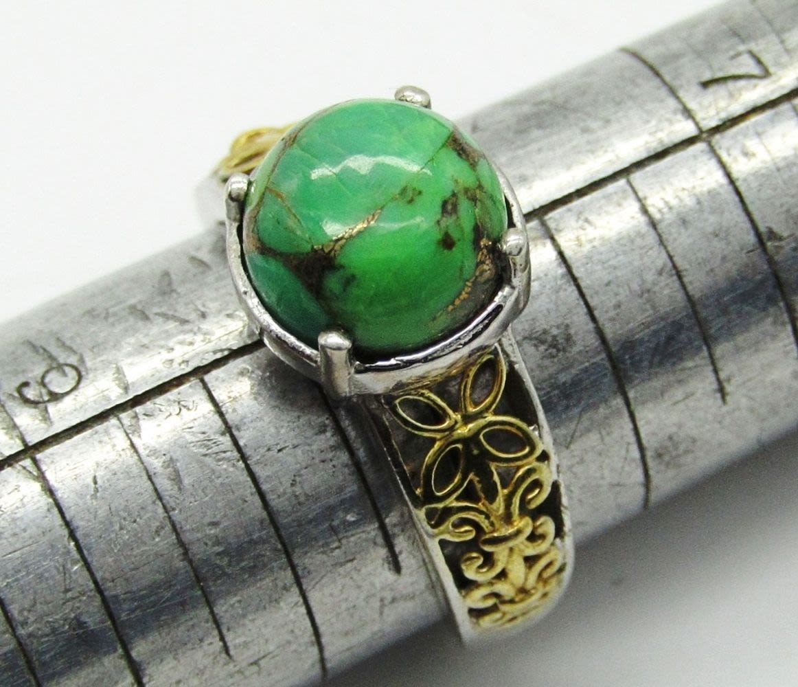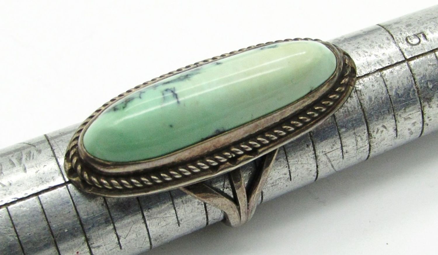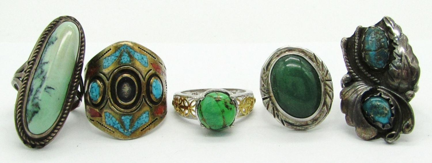 Size 7 Turquoise and Coral Inlay Marked Sterling, Size 8.5 Turquoise Stones & Floral Leaves Marked L.Nez, Size 8 Turquoise Marked STS 925, Size 7.5 Sterling Silver Green Agate, Size 6.5 Sterling Silver and Green Turquoise Marked Sterling; 27 dwt.