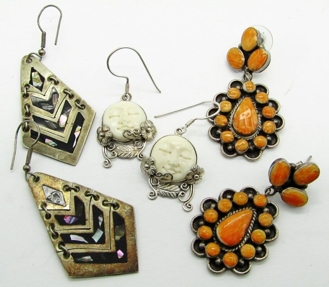 Alpaca Mexico 925 Drop Hook Abalone Shell Chevron, 925 Carved Bone Moon Face, Sterling Orange Spiny Oyster Shell Cluster Dangle; 22 dwt.
