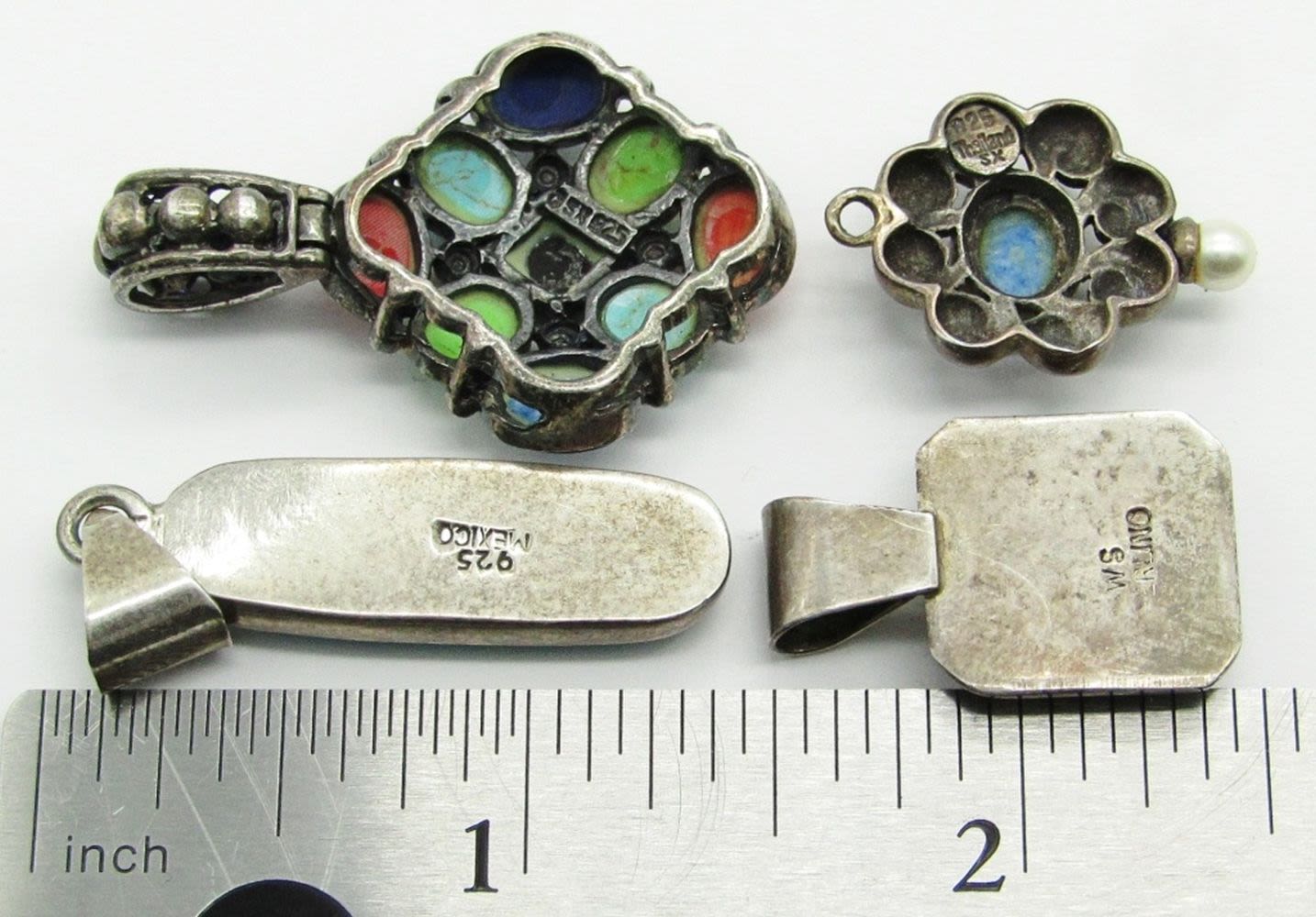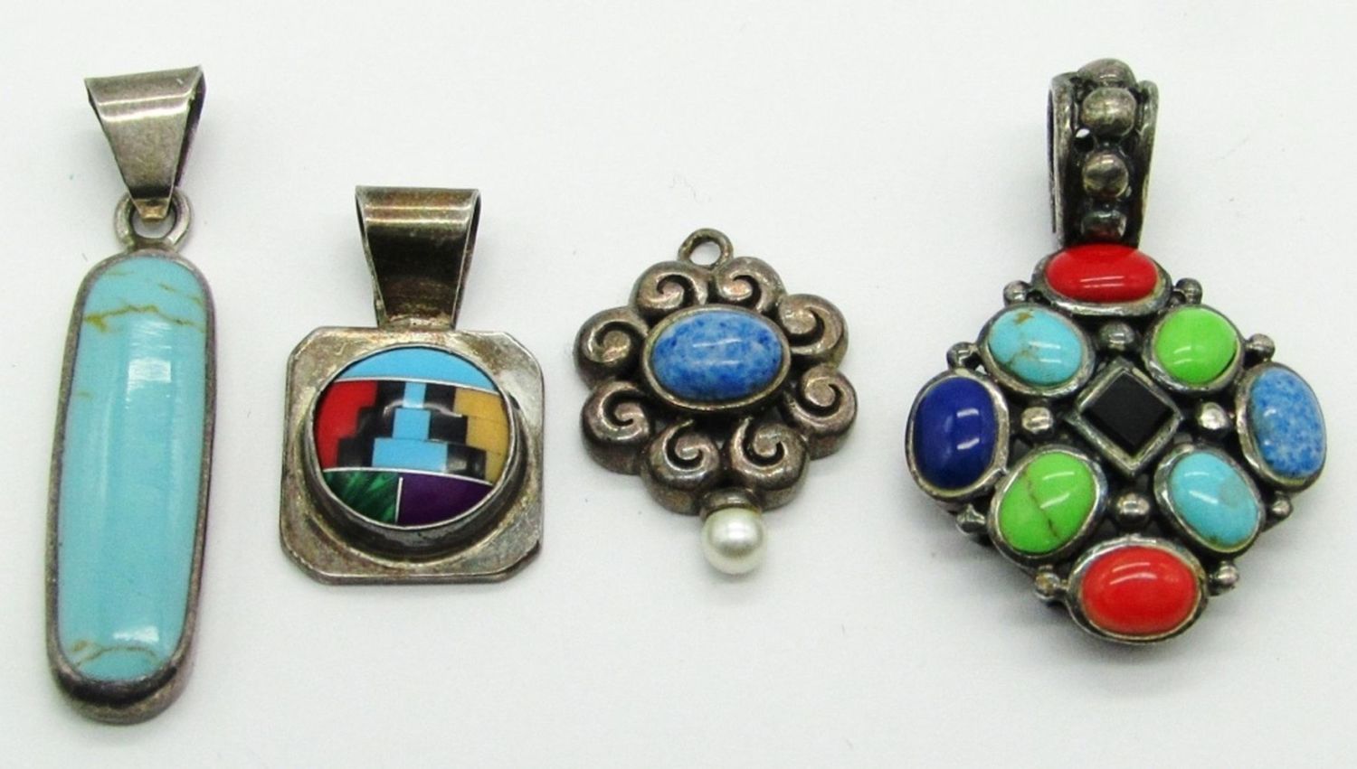Southwest Multi Color Inlay Marked WS STERLING, Long Oval Turquoise Marked 925 MEXICO, Blue Stone With Pearl Marked 925 Thailand SX, Sterling Silver Onyx Multi Color Stone Marked CSX 925; 13 dwt.