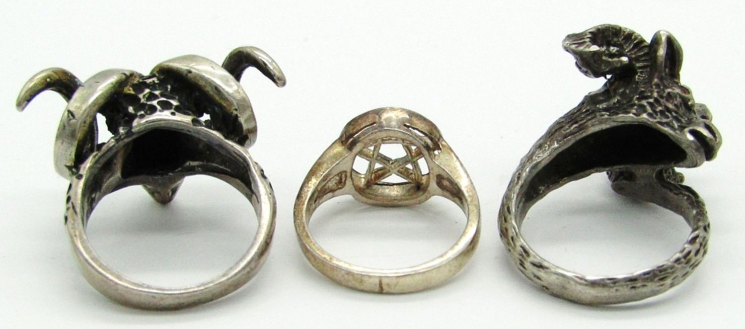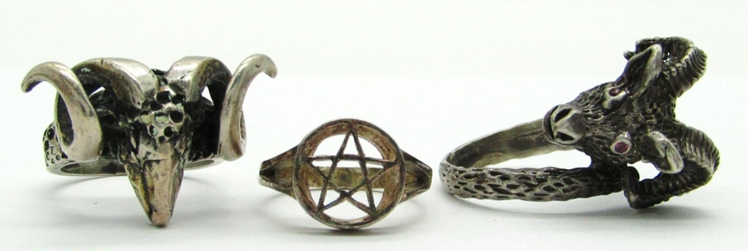 Size 6 Ram’s Head Marked “G”, Size 5 Ram’s Head Marked Sterling, Size 4 Pentagram Marked 925; 14 dwt.