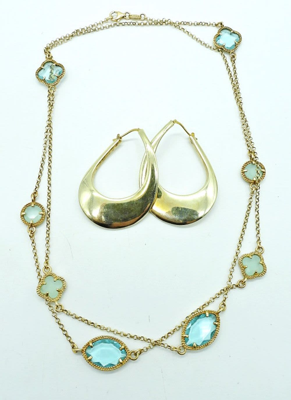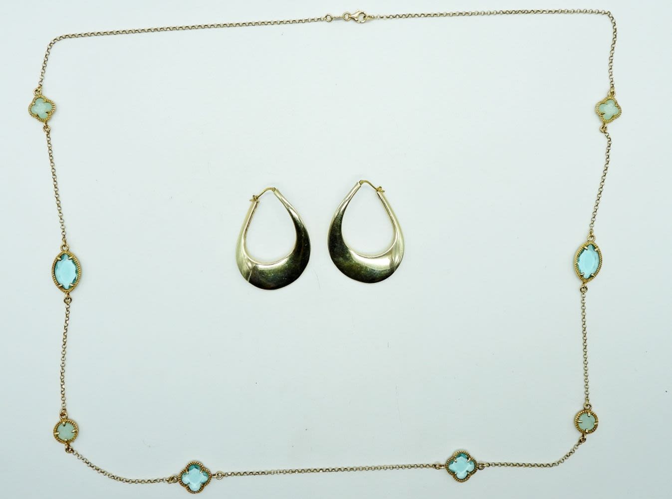 17.2DWT, GOLD PLATED STERLING, 35 1/2IN LONG NECKLACE WITH LOBSTER CLASP BLUE STONE ALL ALONG, PIERCED HOOP EARRINGS, BOTH STAMPED 925 ITALY