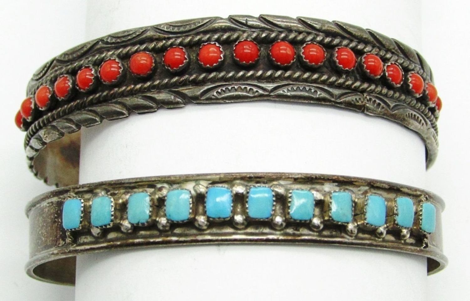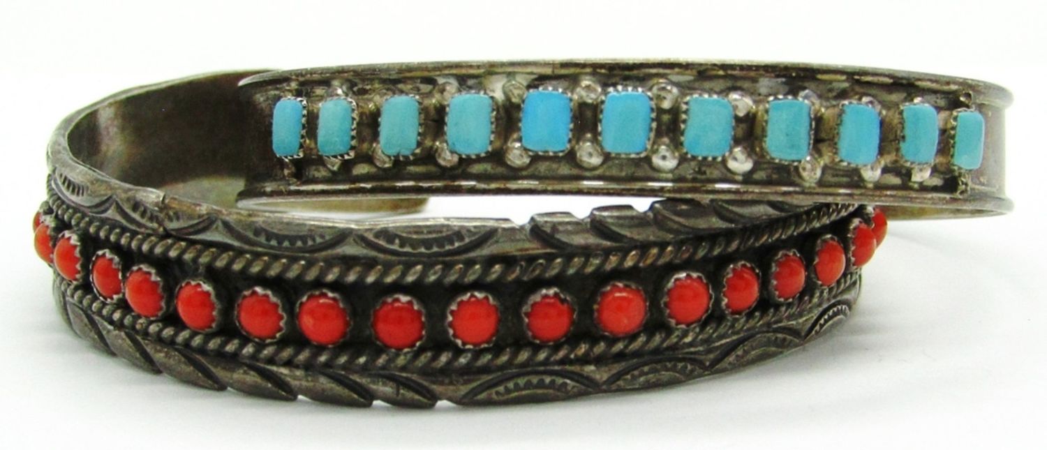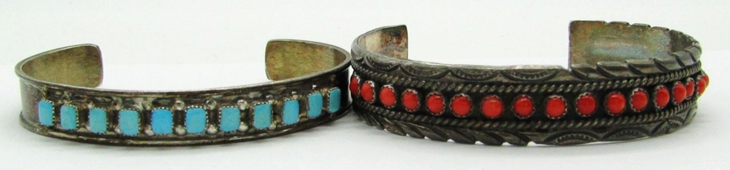 6.5″ Sterling Silver & Coral Stones Marked H Sterling, 6.5″ Sterling Silver and Turquoise Stones Unmarked; 23 dwt.