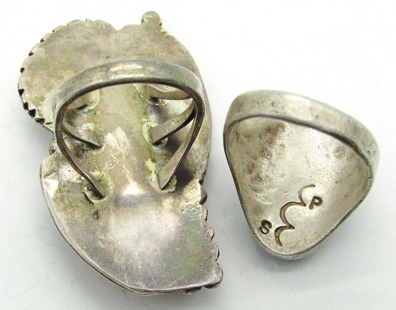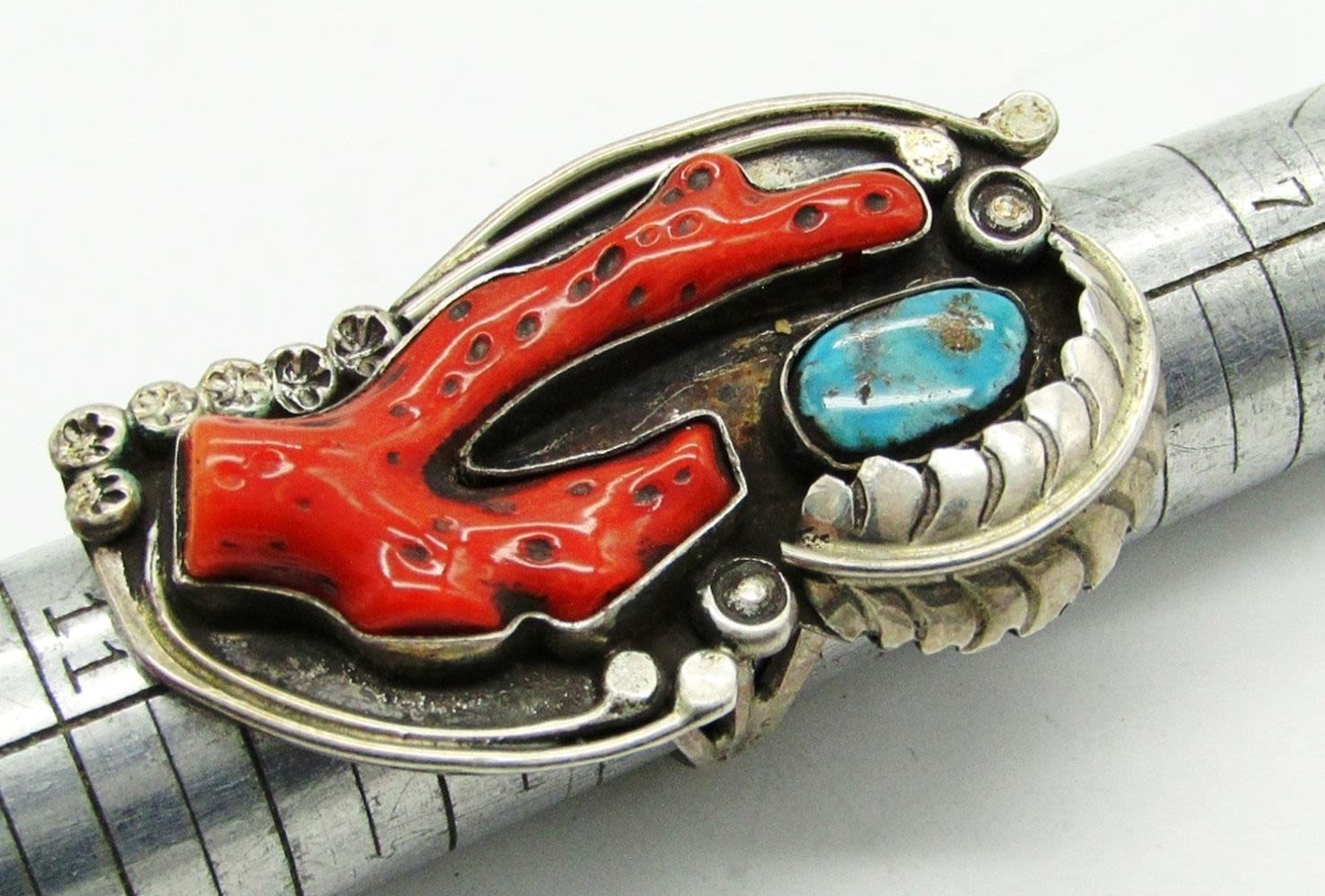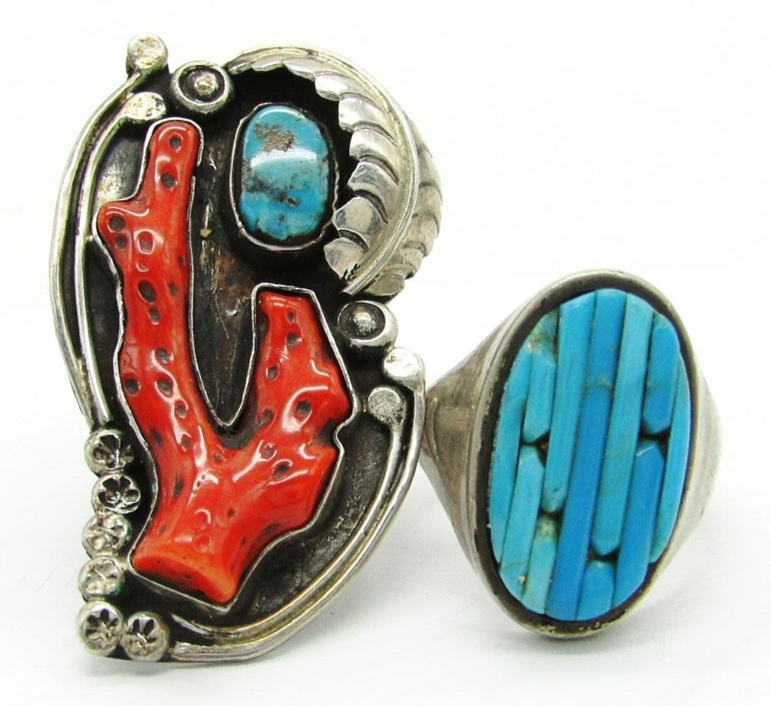 Size 10 Turquoise Cluster Marked SP, Size 9 Coral Cactus and Turquoise Stone Unmarked; 20.5 dwt.