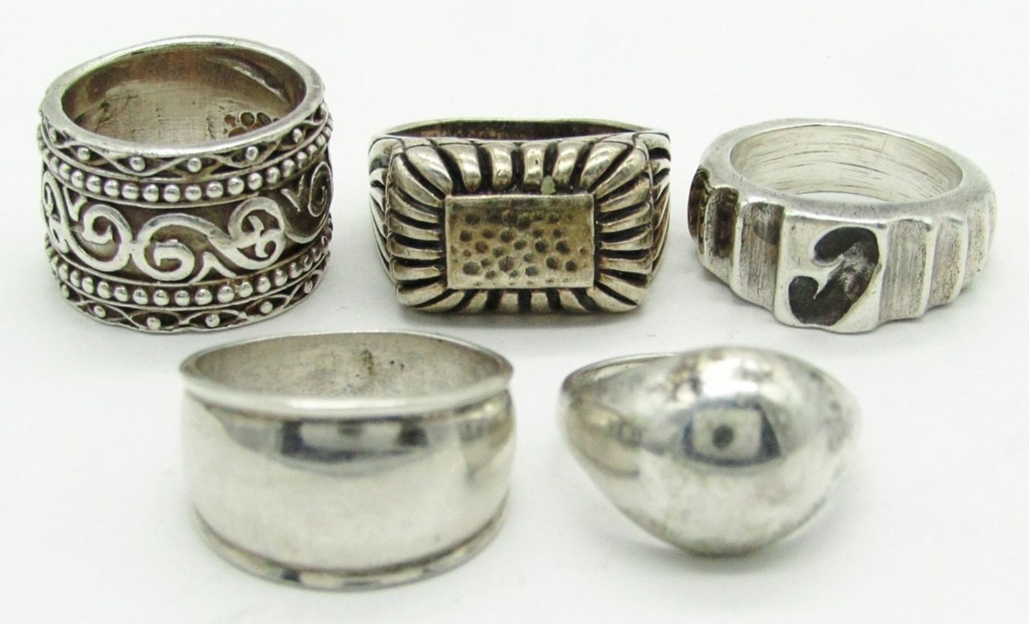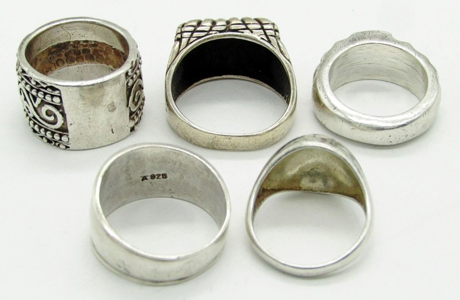 Size 10.5 Marked 925, Size 10 Marked A925, Size 7 Unmarked, Size 8 Marked Sterling; 31.6 dwt.