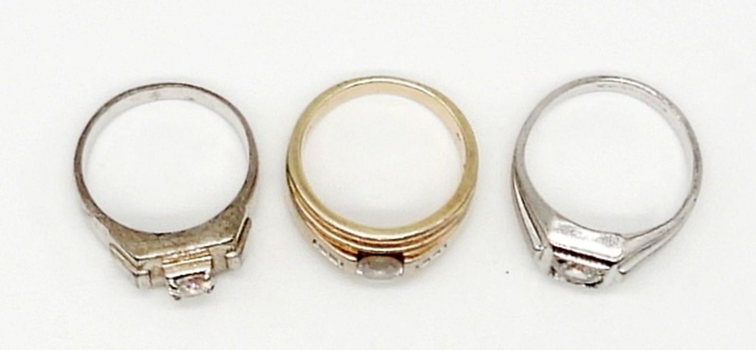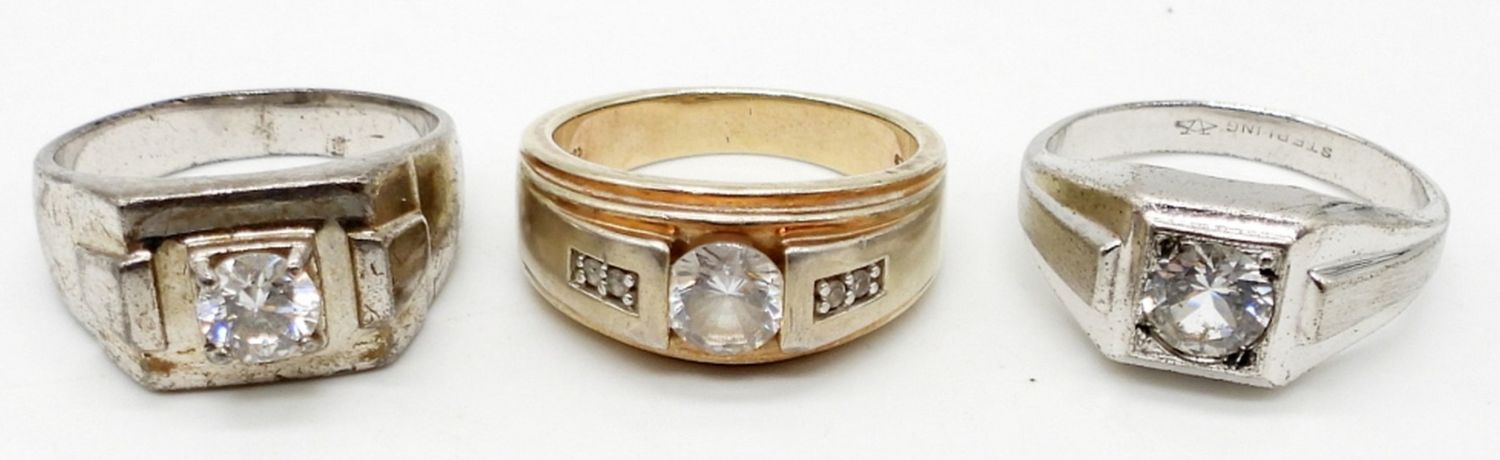 MEN’S LOT OF (3) STERLING SILVER RINGS WITH CRYSTAL CENTER STONES – SIZES 11-12 – 17.4 DWT – ALL MARKED STERLING / 925