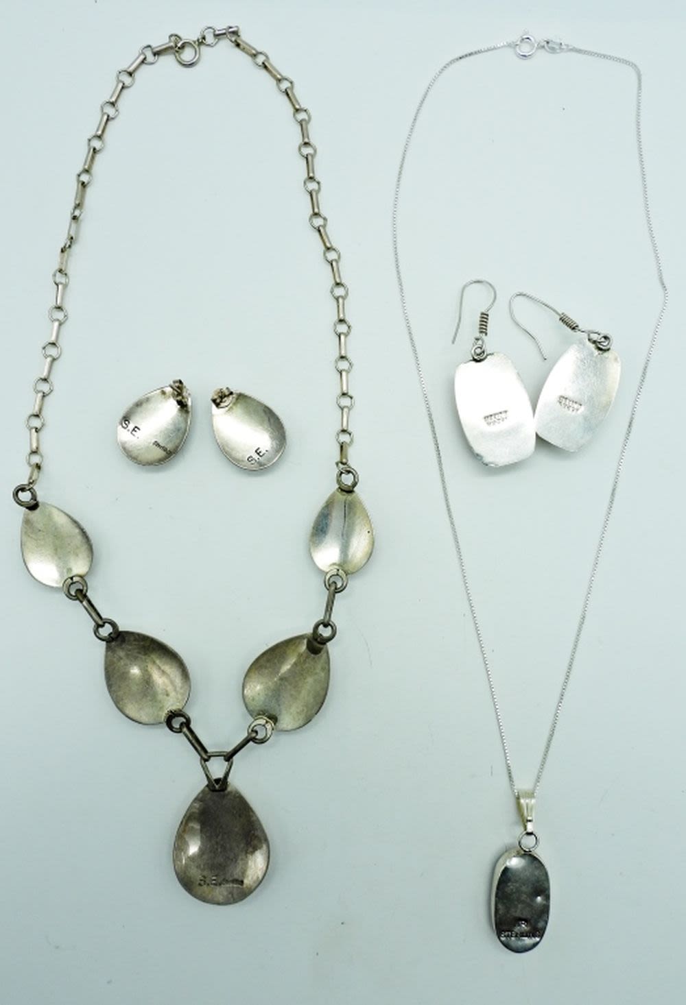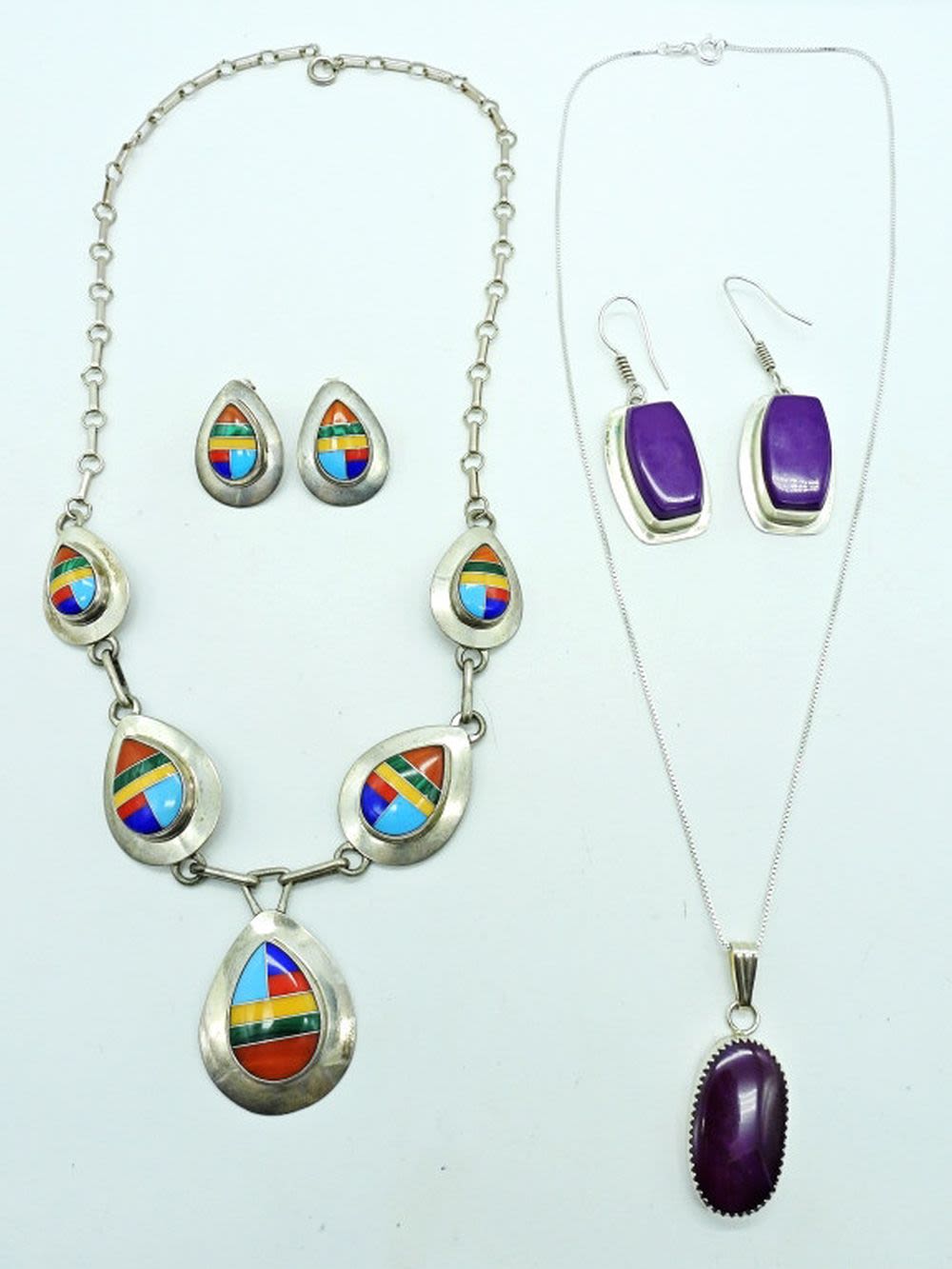 31DWT, 1 PURPLE INLAY NECKLACE 20IN LONG, STAMPED BEHIND PENDANT JB STERLING, MATCHING DANGLED EARRINGS STAMPED 925, 1- MULTI-COLOR INLAY FESTOON NECKLACE 20IN LONG WITH MATCHING STUDS STAMPED S.E. STERLING