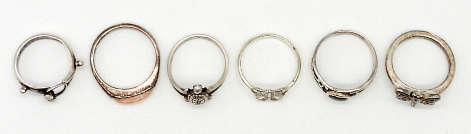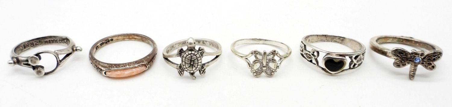 STERLING SILVER RINGS WITH BLACK ONYX, PINK NATURAL STONE, TURTLE, BUTTERFLY, HEART (One Has Missing Stone) – SIZES 5-8 – 9.8 DWT – MARKED 925, STERLING, MEXICO STERLING