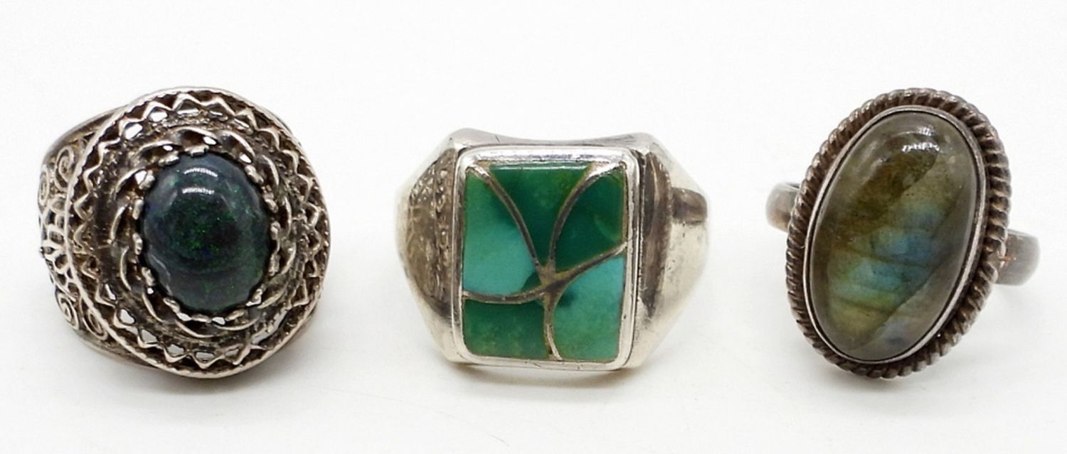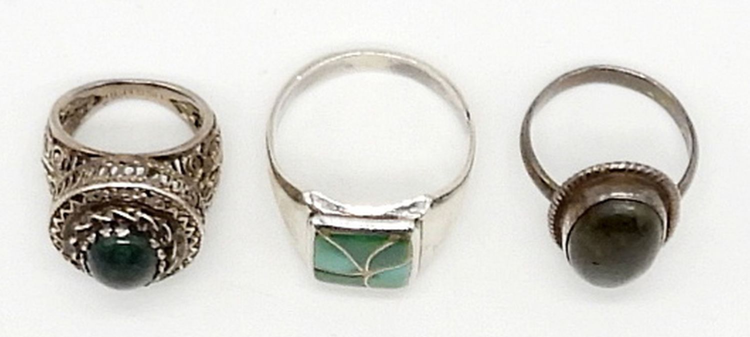 STERLING SILVER WITH GREEN & TURQUOISE NATURAL CENTER STONES – SIZES 3, 6, & 11 – SIGNED ELB, MARKED 925, MARKED STERLING – 12.2 DWT