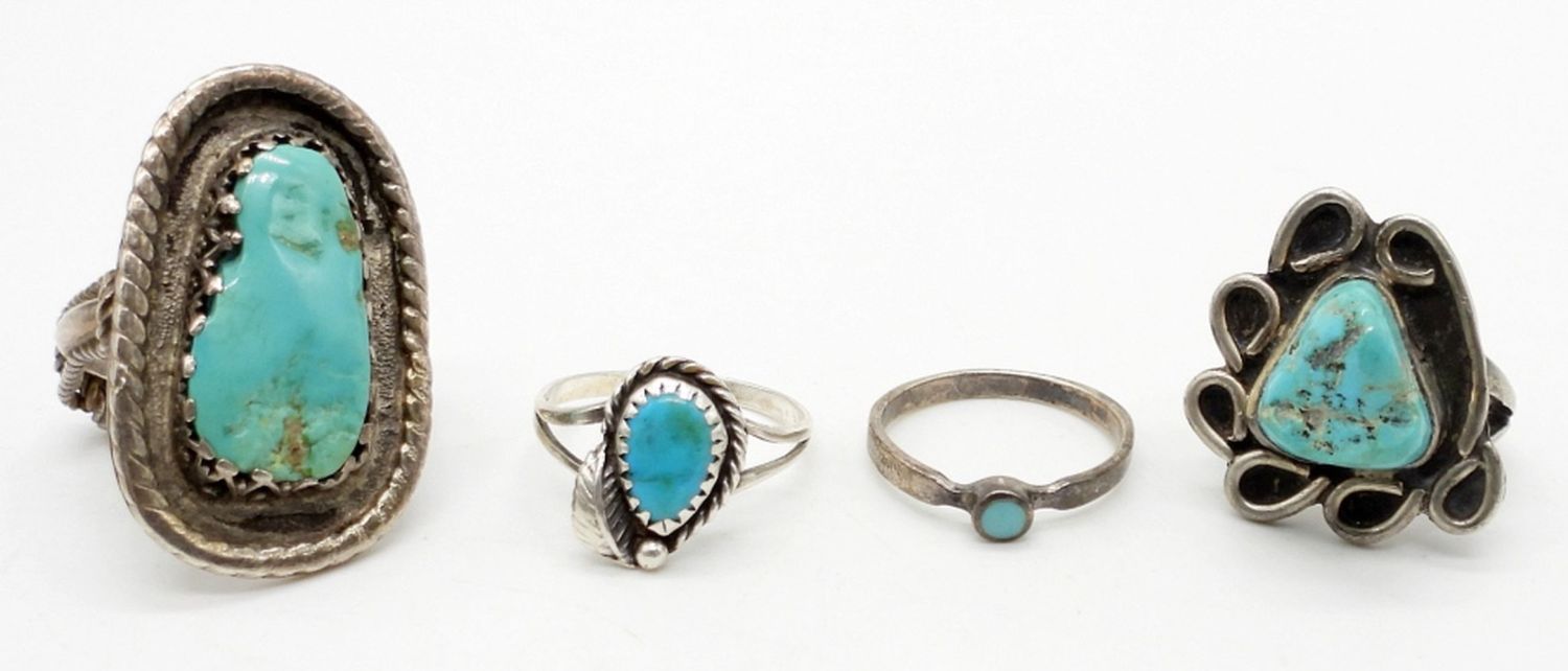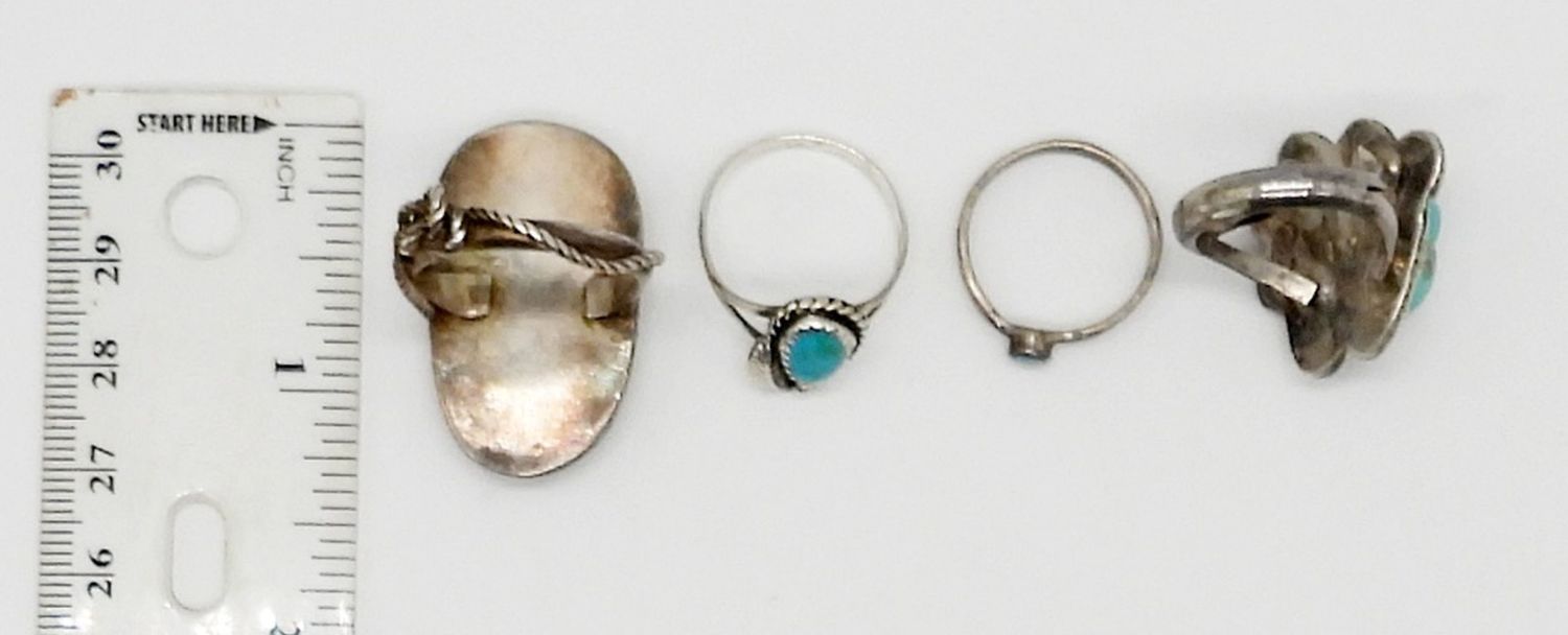 STERLING SILVER RINGS WITH LARGE & SMALL TURQUOISE STONES, SOUTHWEST STYLE – SIZES 6, 7, 8, & 10 – 16 DWT – MARKED LY, CN 925