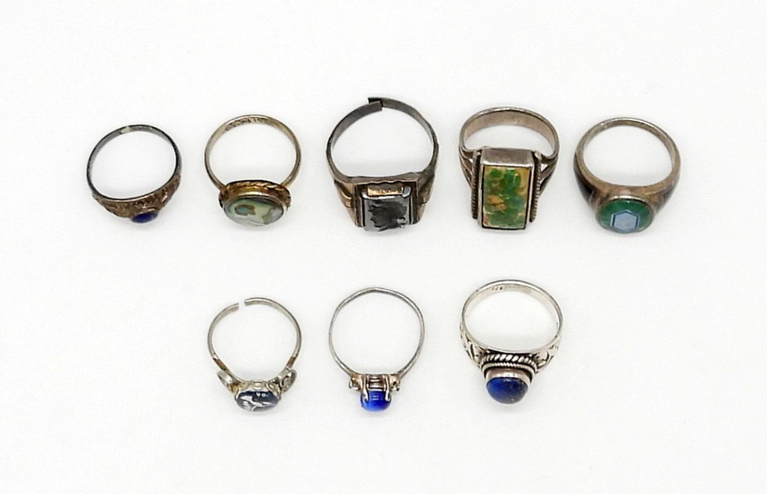 STERLING SILVER RINGS, CATS EYE, ABALONE, CARVED & ETCHED STONES – SIZES 6-7 (2) ADJUSTABLE – 21 DWT – SOME MARKED 925