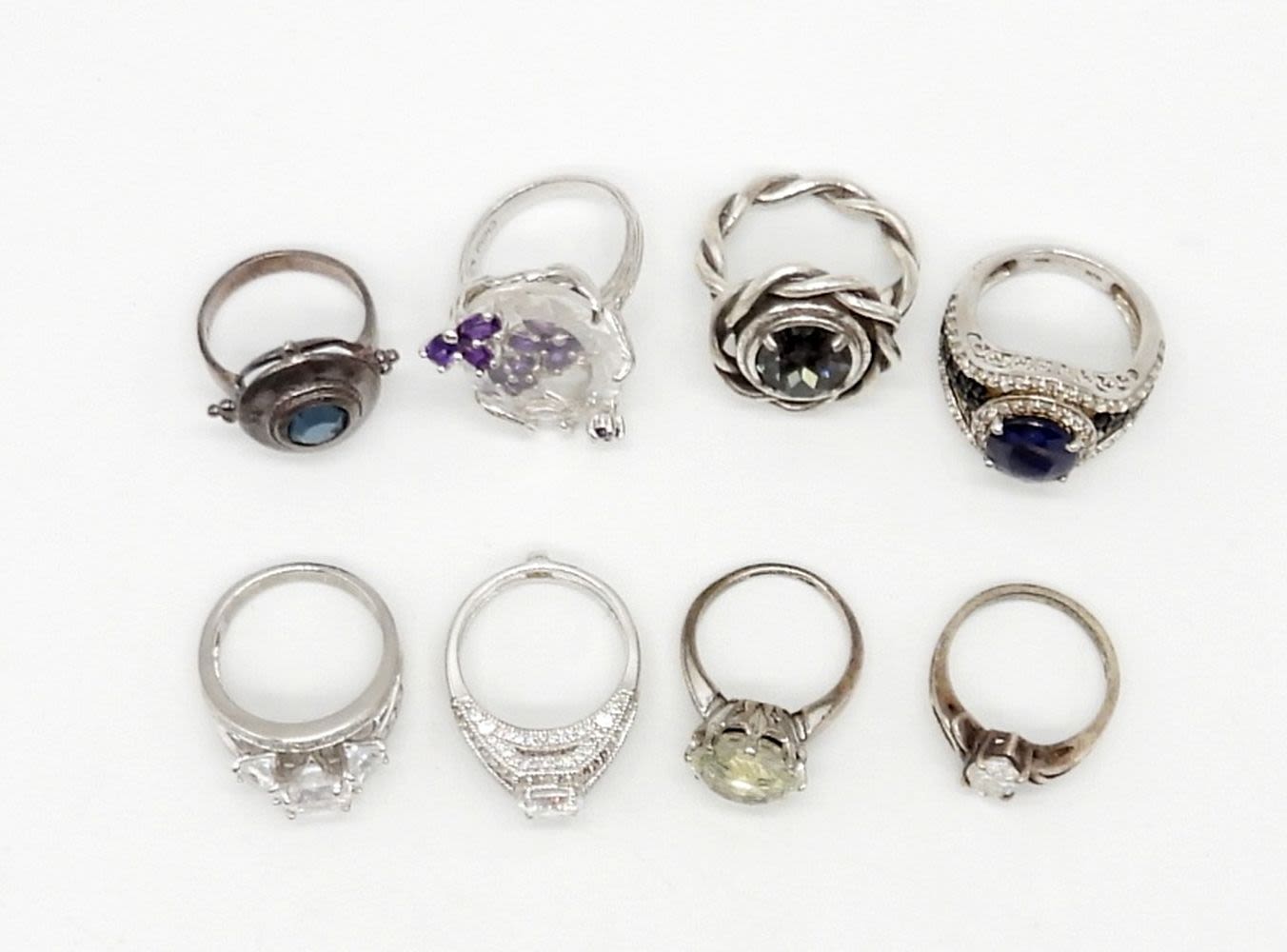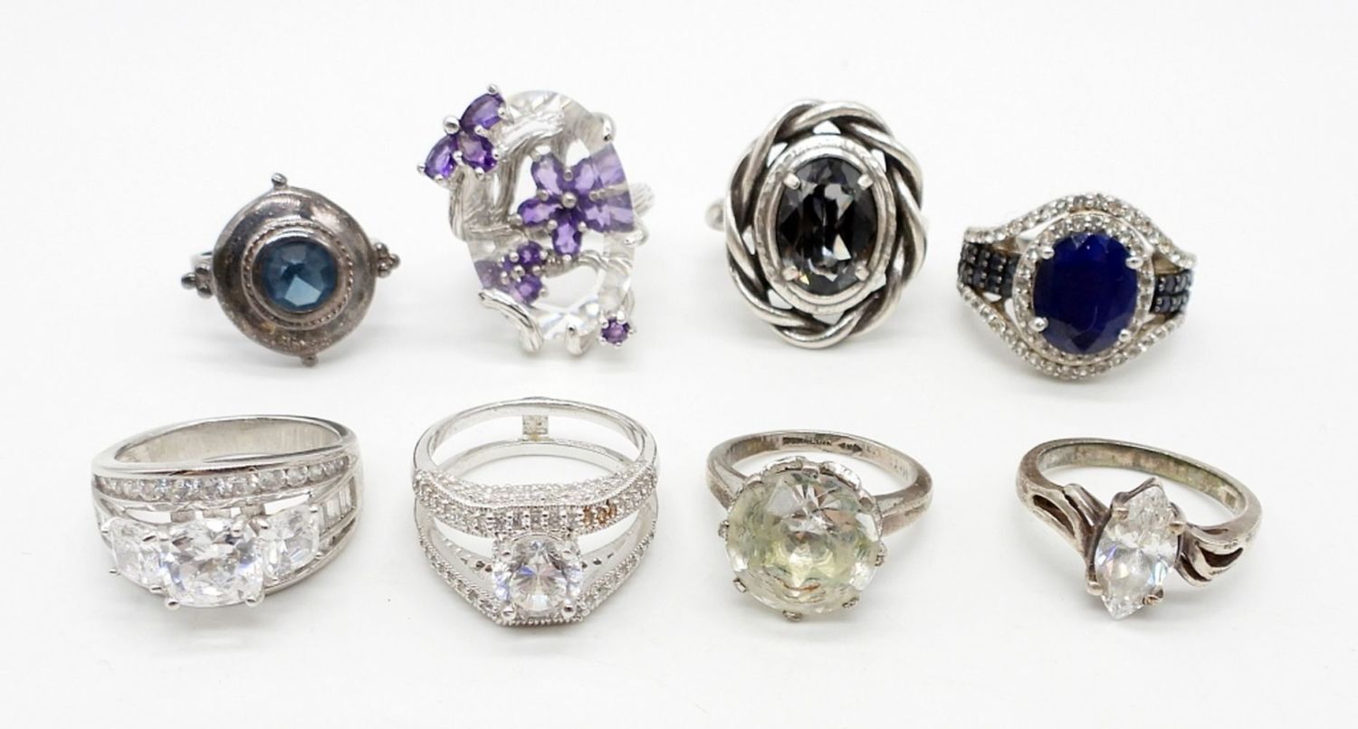 STERLING SILVER LARGE FASHION RINGS WITH CLEAR, BLUE & PURPLE RHINESTONES – SIZES 6-8 – 36.5 DWT – SOME MARKED 925 / CHINA