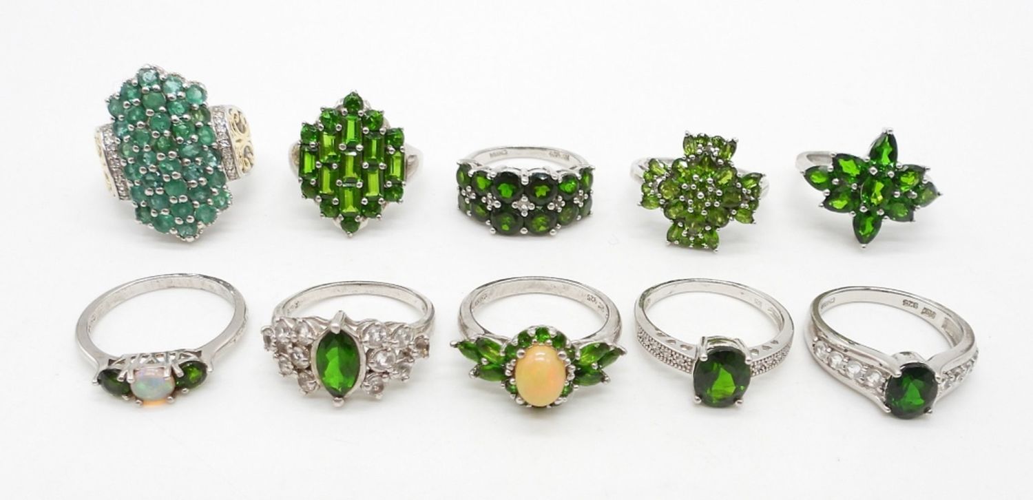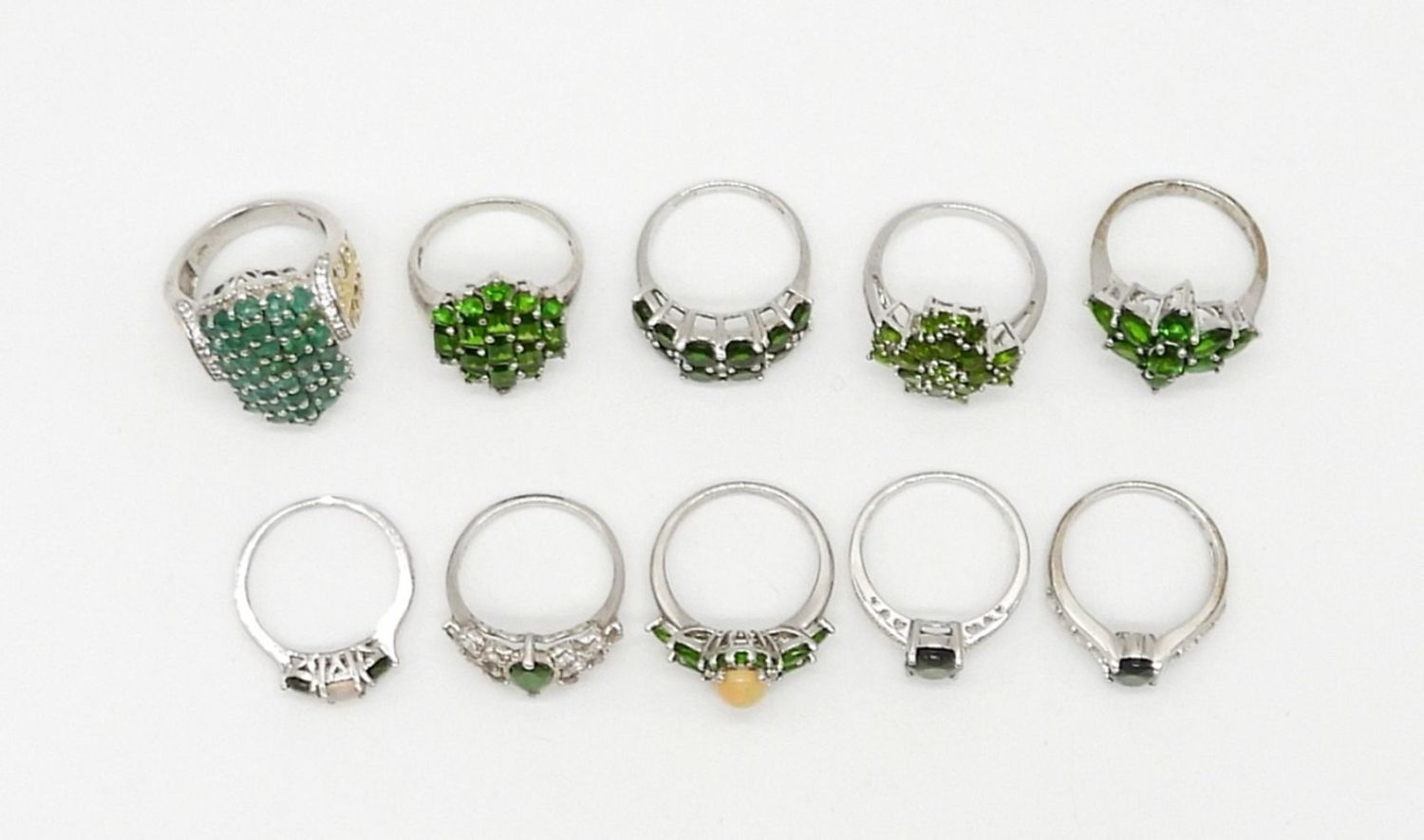 STERLING SILVER FASHION RINGS WITH GREEN GEMSTONES – ALL SIZE 8 – ALL MARKED 925 – CHINA / INDIA – 28 DWT