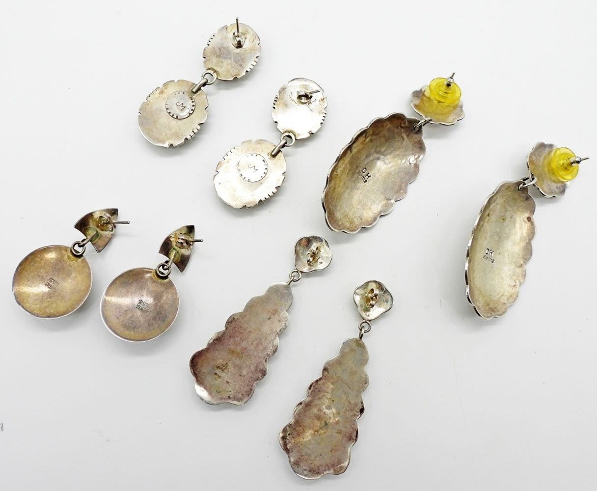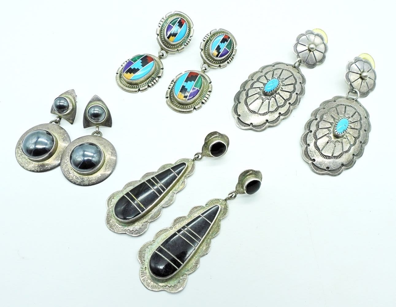 52DWT, 1- TURQUOISE PAIR STAMPED DH STERLING, 1 BLACK ONYX INLAY STAMPED JR 925, 1 MULTI-COLOR INLAY PAIR STAMPED JON MCRAY J H M SS, 1 HEMATITE PAIR STAMPED RJA STERLING, ALL PIERCED BETWEEN 1 1/2 TO 2IN LONG