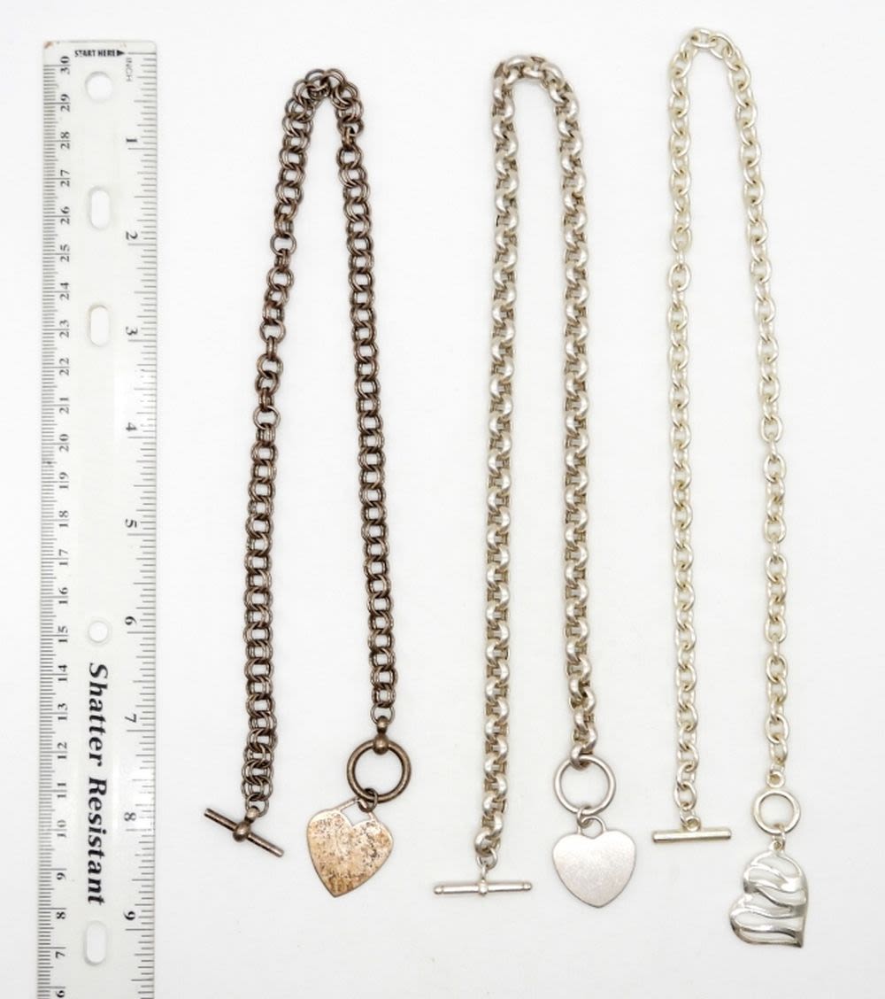 16″-17″ LENGTHS – STERLING SILVER CHAIN TOGGLE CHOKERS WITH HEARTS – 57.7 DWT – (1) MARKED 925