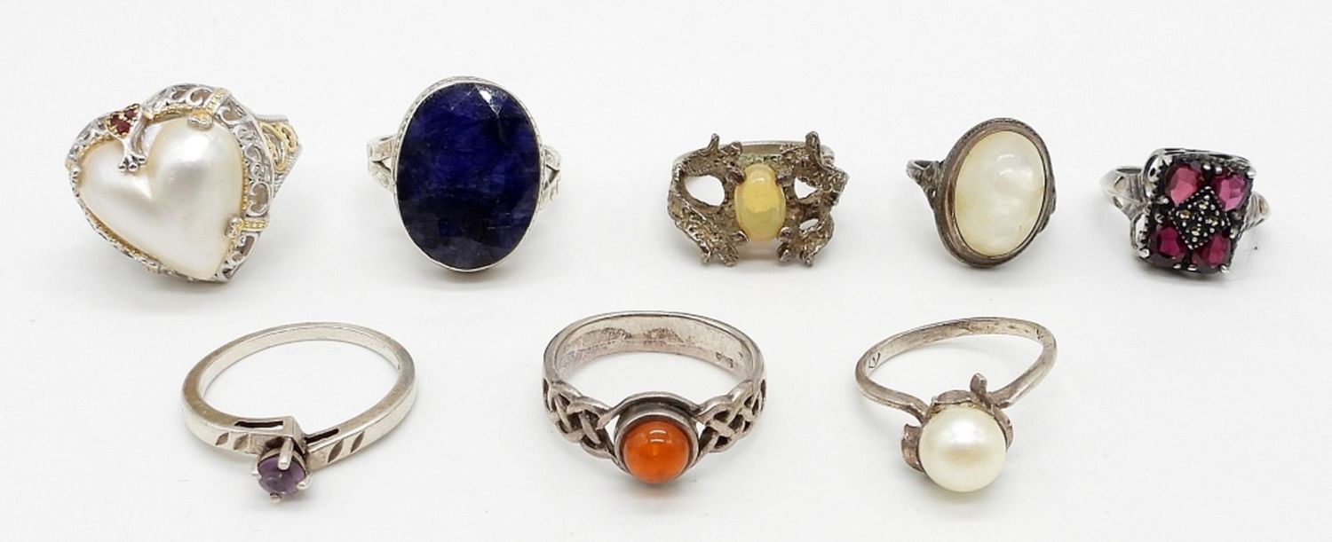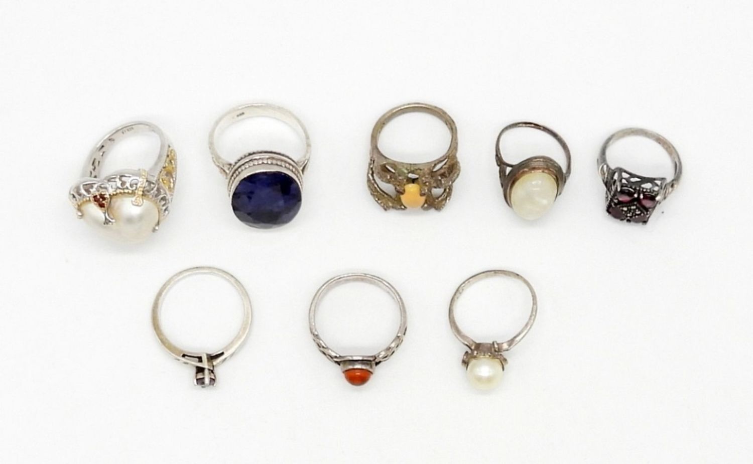 STERLING SILVER RINGS WITH MOTHER OF PEARLS & SMOOTH NATURAL STONES – 23 DWT – ALL MARKED STERLING 925 – SIZES 5-9