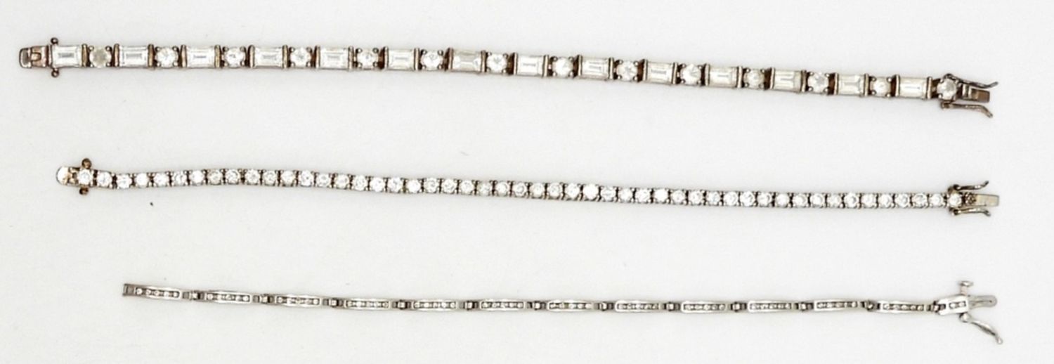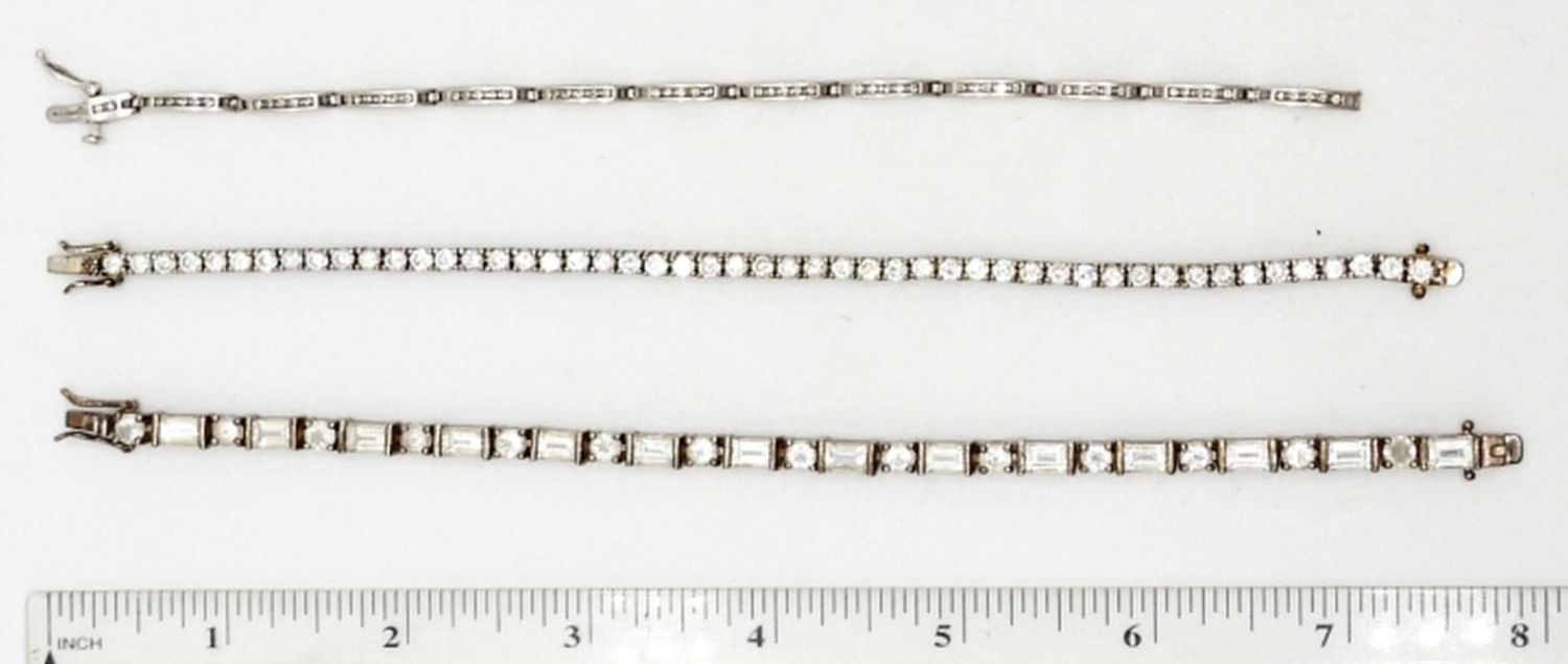 STERLING SILVER & CRYSTAL RHINESTONE TENNIS BRACELETS, 7″-8″ LENGTHS – 23.8 DWT – (2) MARKED 925