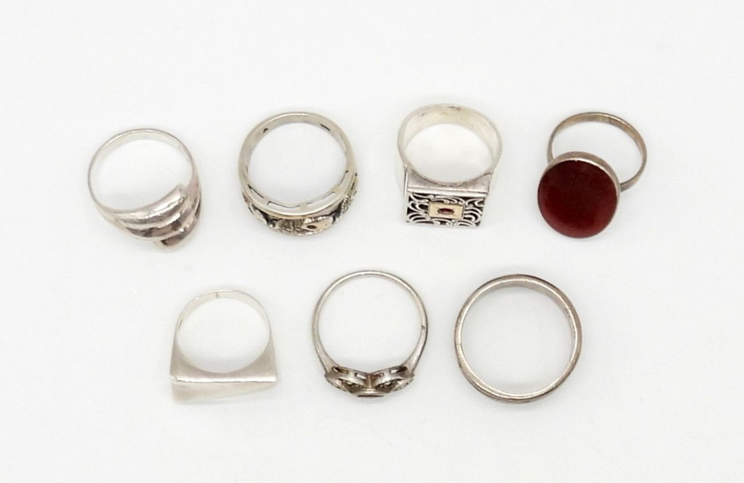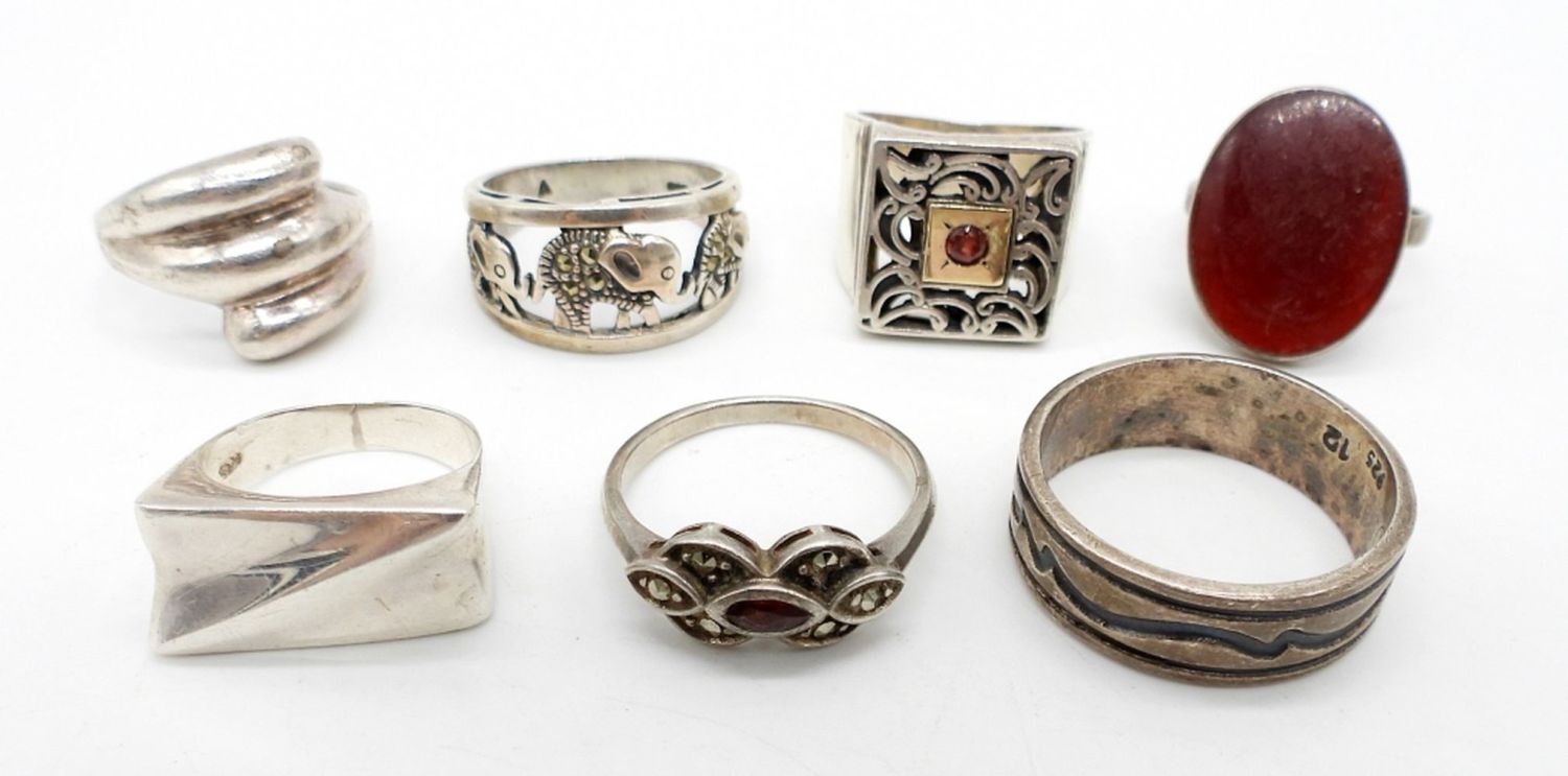 STERLING SILVER VINTAGE STYLE FASHION RINGS WITH MARCASITE, ENGRAVING, & NATURAL STONES – MARKED 925, AE – 25 DWT – SIZES 6-11