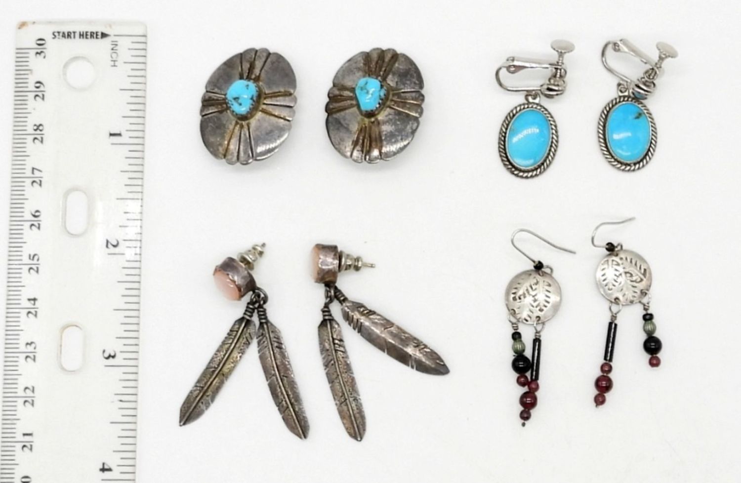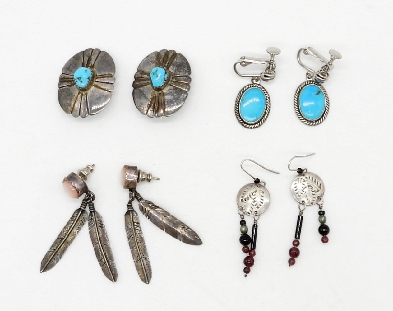 STERLING SOUTHWEST STYLE EARRINGS WITH TURQUOISE & NATURAL STONES, (2) PIERCED, (2) CLIP-ON, MARKED STERLING – 16.5 DWT