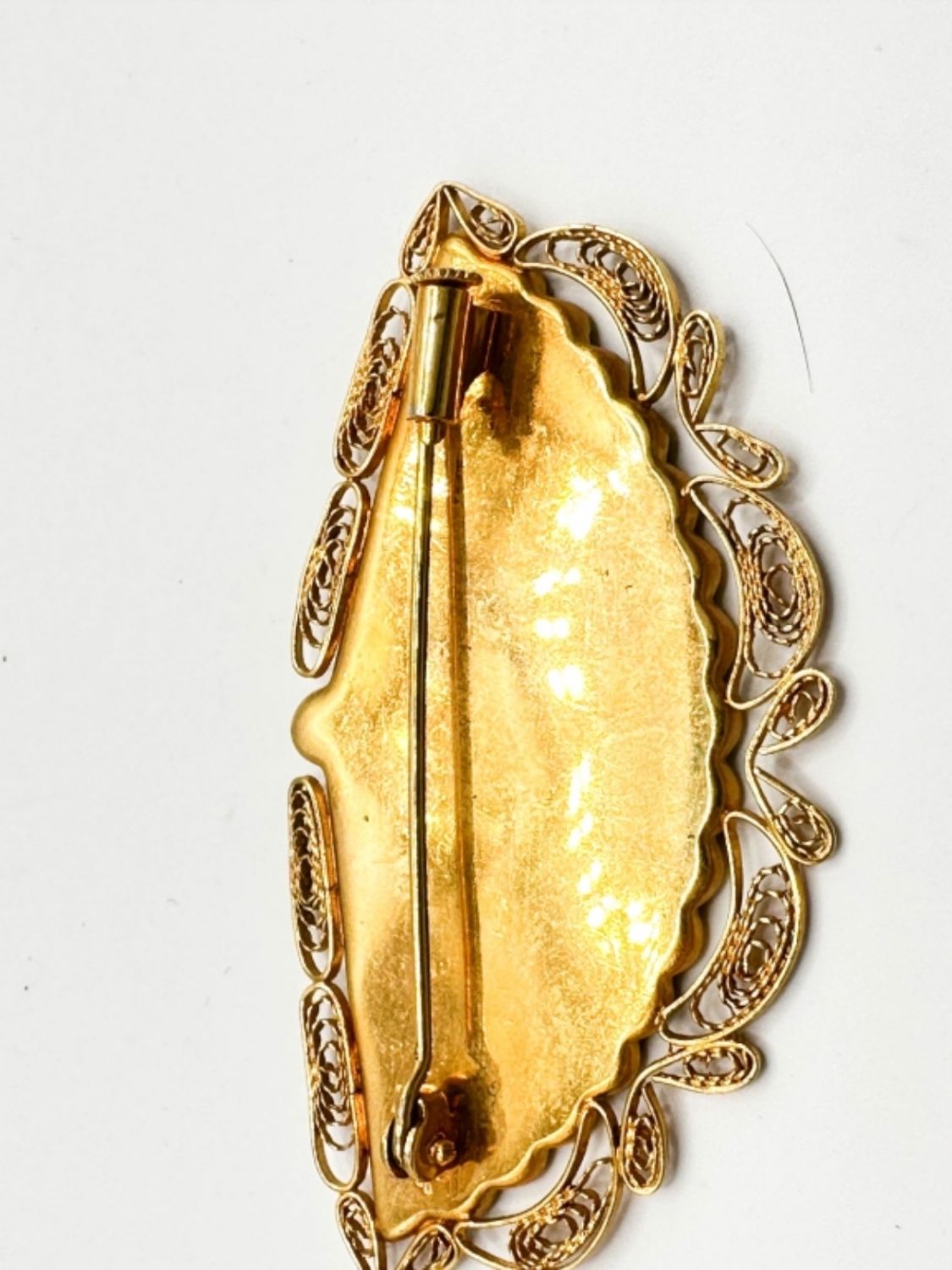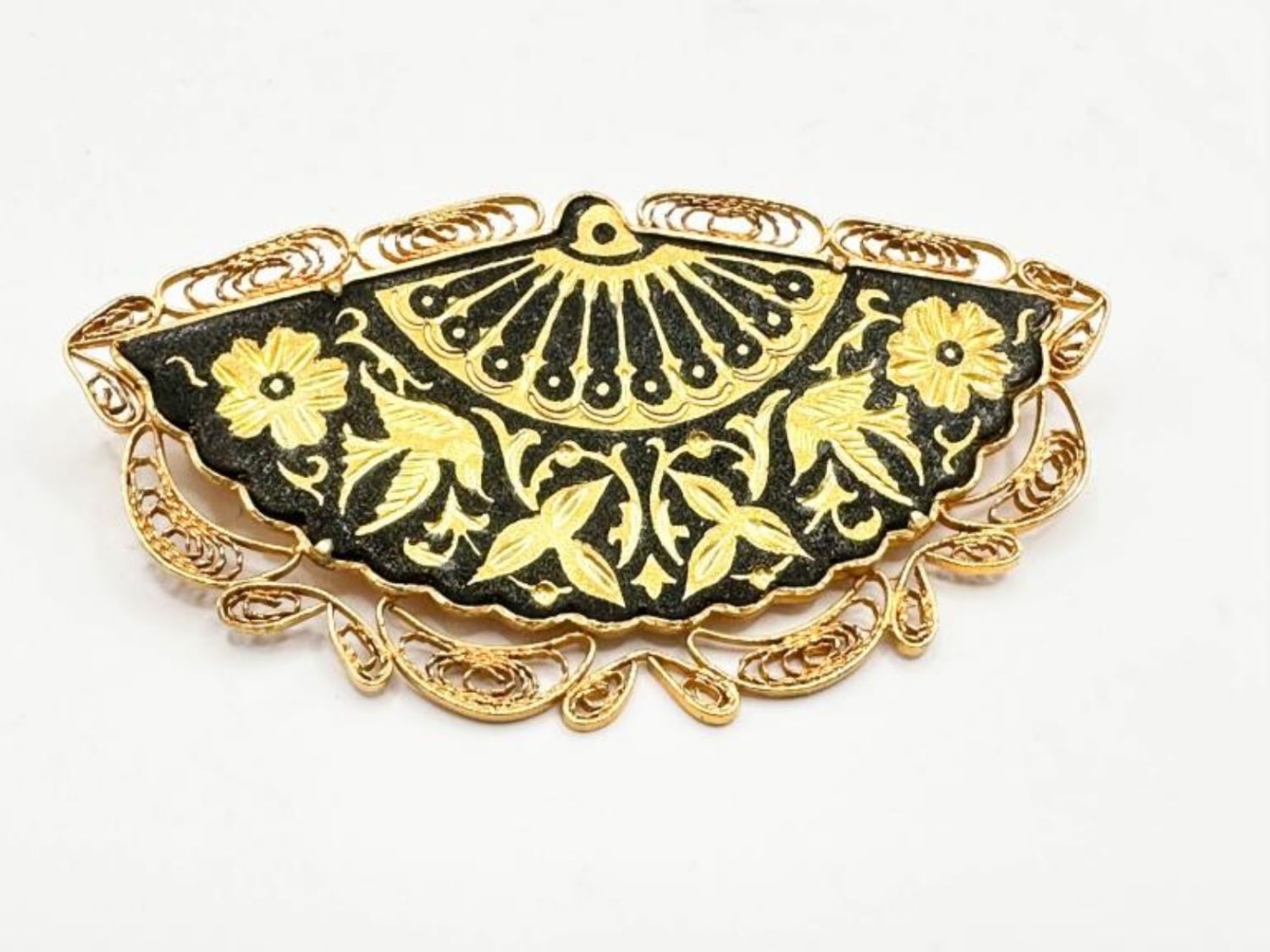 LARGE DAMASCENE ELEGANT BROOCH WITH FLOWERS AND BIRDS