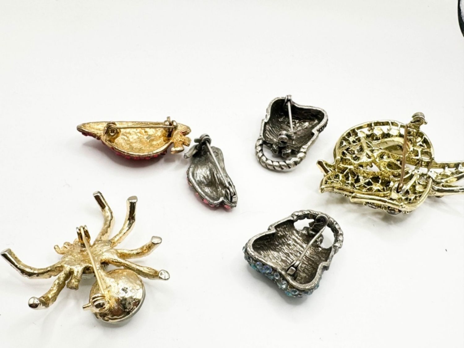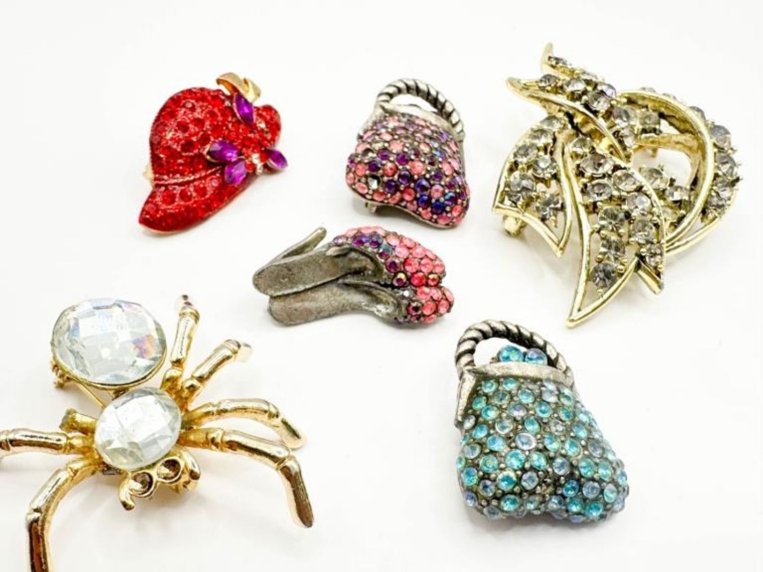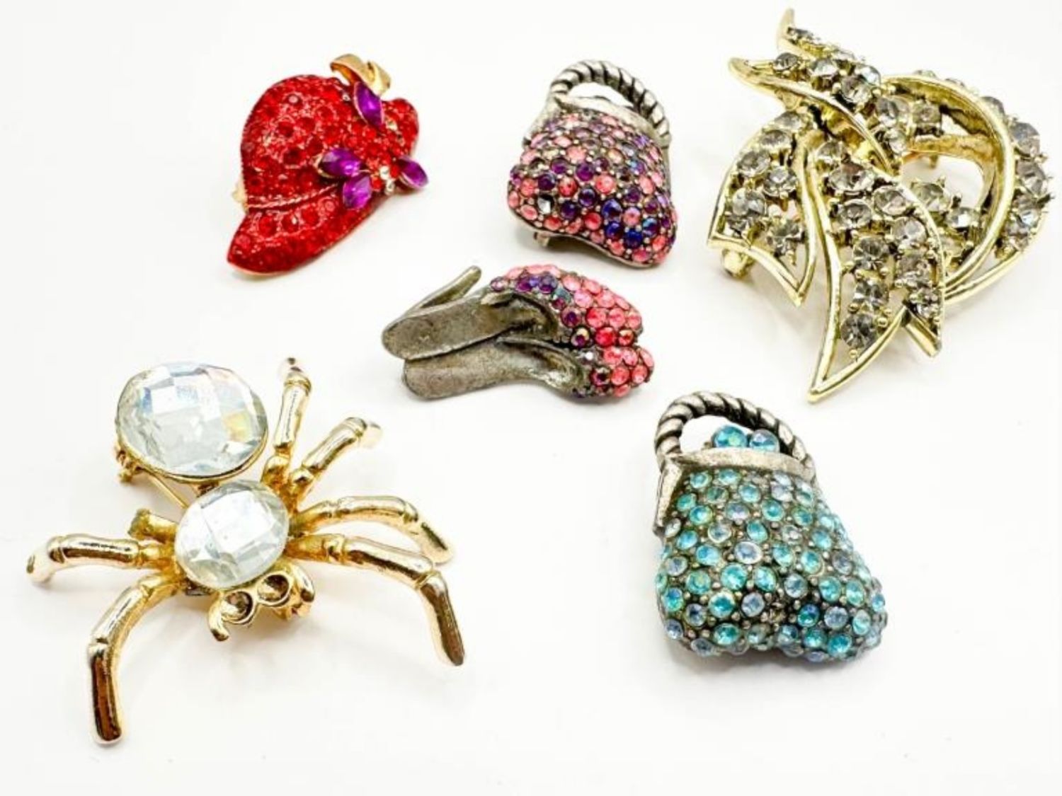 BROOCH ASSORTMENT INCLUDES, SHOES, HAT , PURSES AND SPIDER W STONES