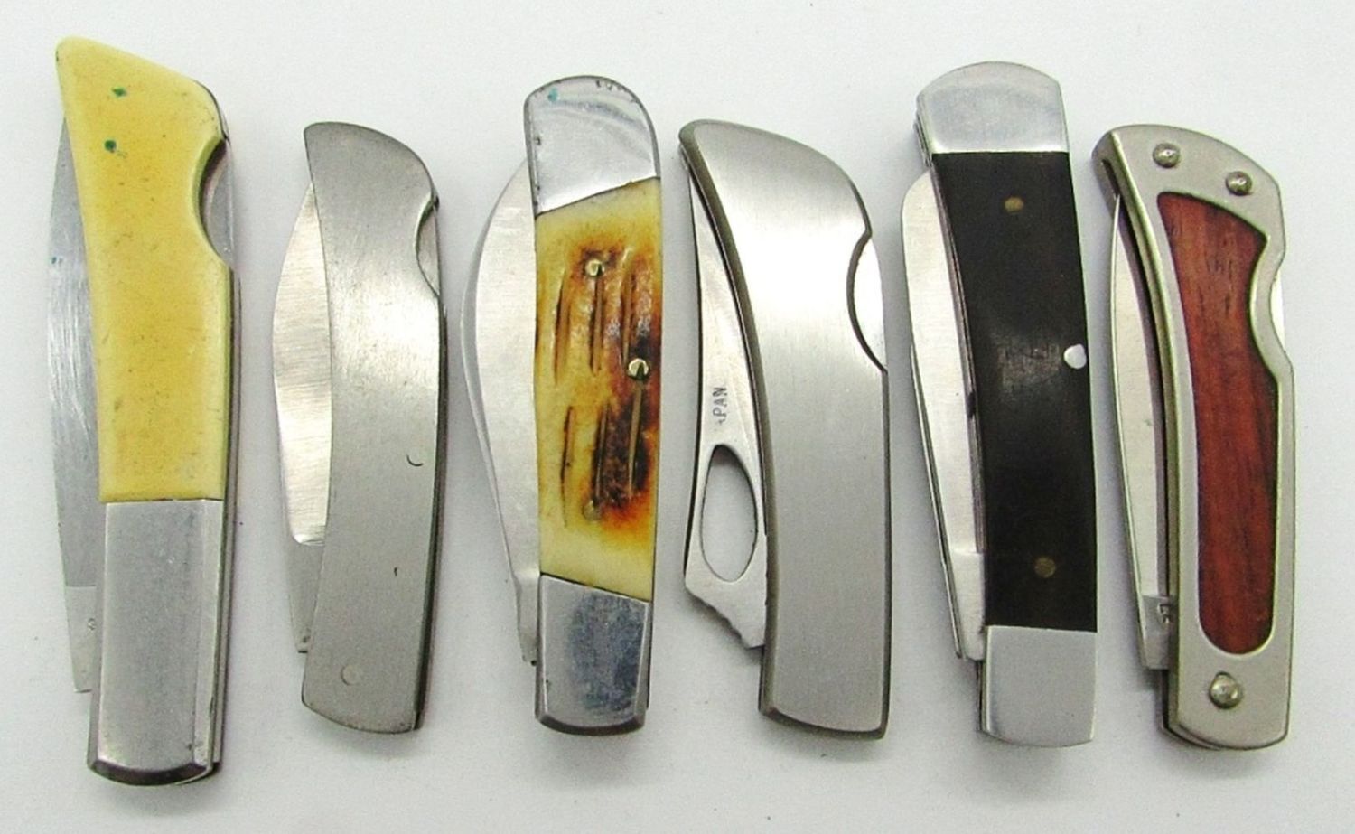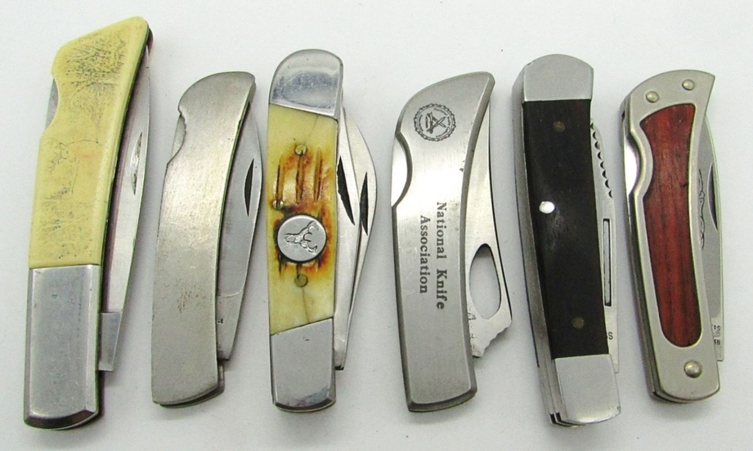 Single Blade Gerber Silver Knight Japan, Single Blade Frost Cutlery “National Knife Association”, 2-Blade Whitetail Cutlery, Single Blade Parker Brothers “Challenger”, Single Blade Stainless, 2-Blade Stainless;Used Conditions.