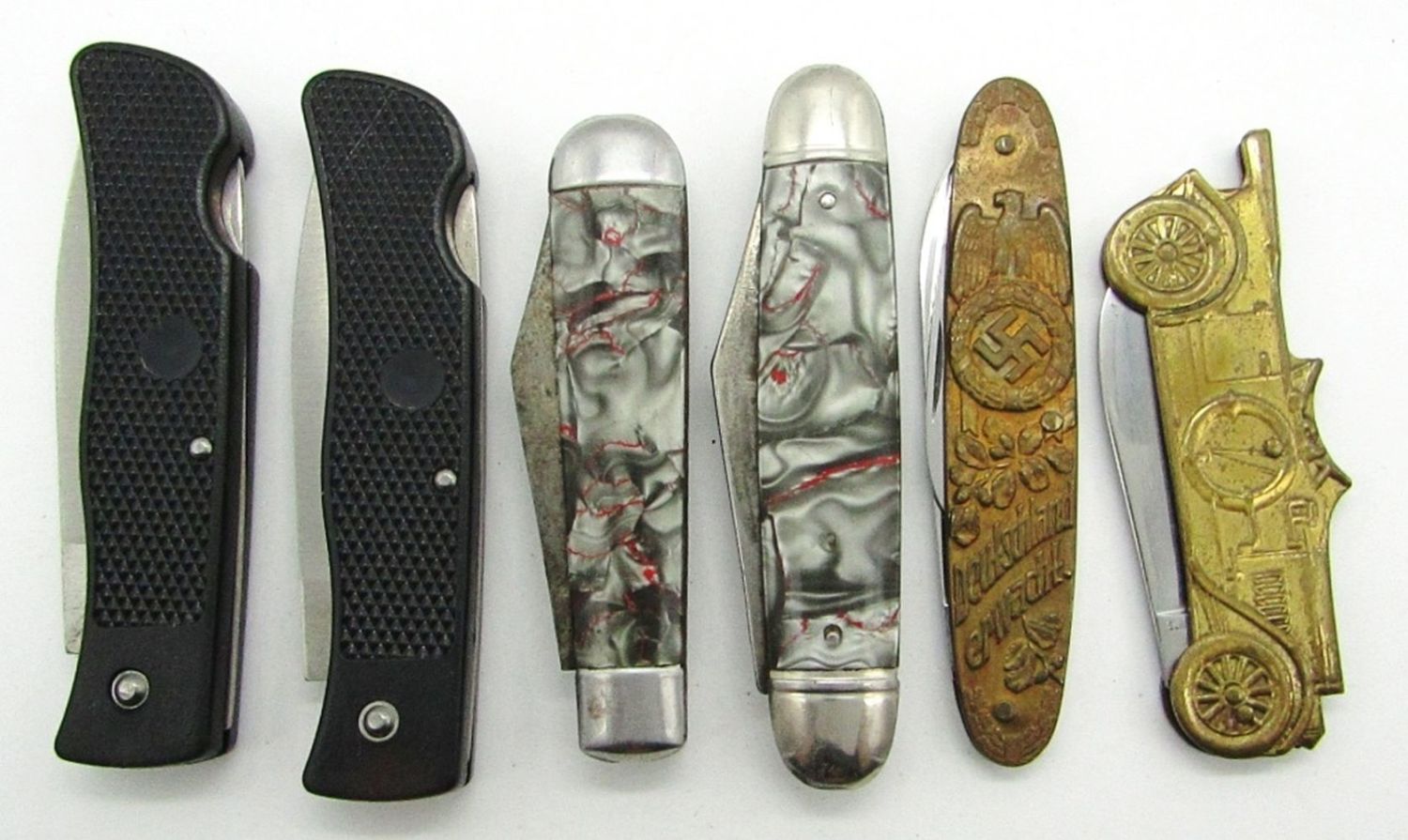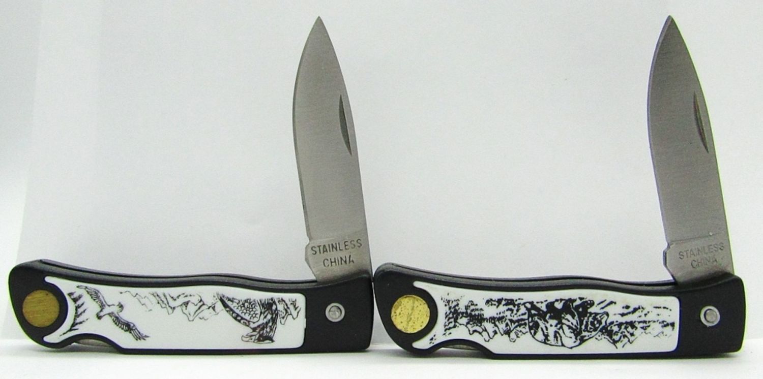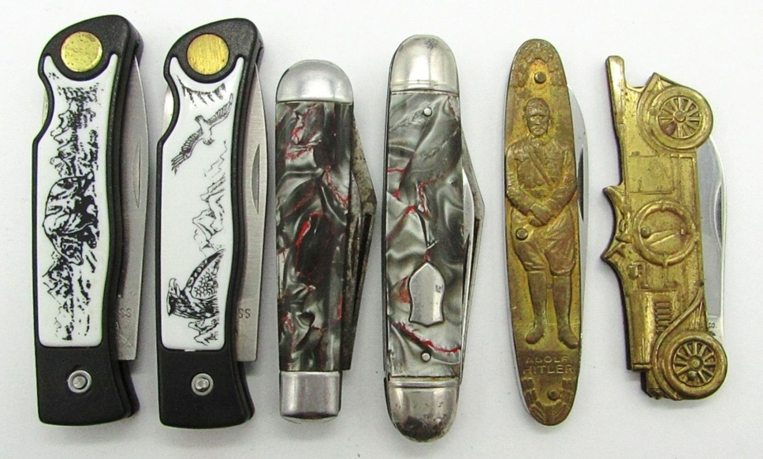 (2) Single Blade Scrimshaw Bear & Eagles, 2-Blade Hammer Brand, 2-Blade USA, 2-Blade Adolf Hitler Germany, Single Blade Parker Cut Co.; Used and Like New Conditions.