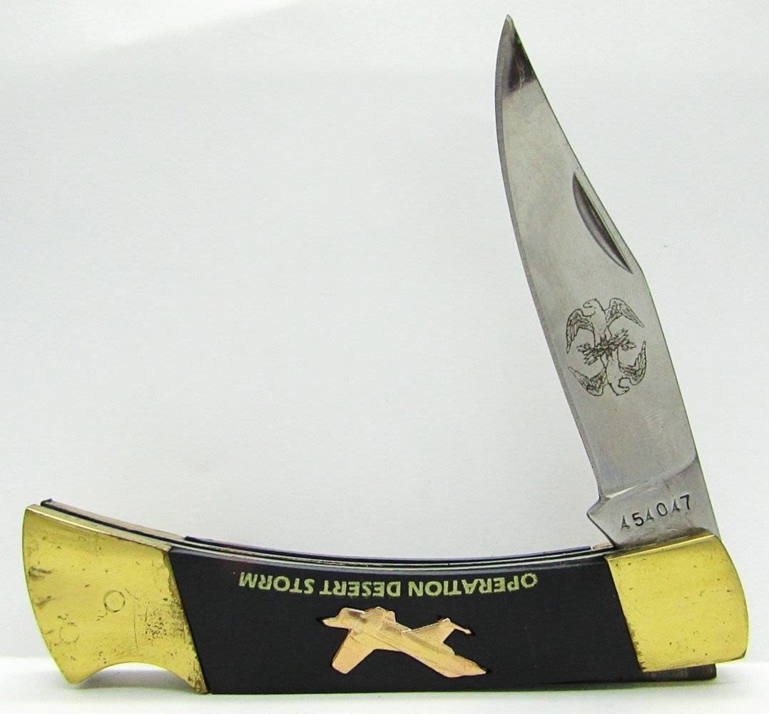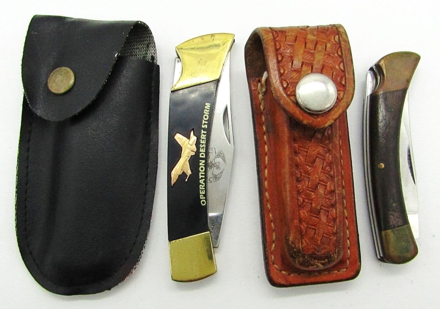2-Blade Browning Japan with Browning Holder Marked “Handcrafted in Mexico”, Single Blade Operation Desert Storm 454047 with Black Holder; Used Conditions.