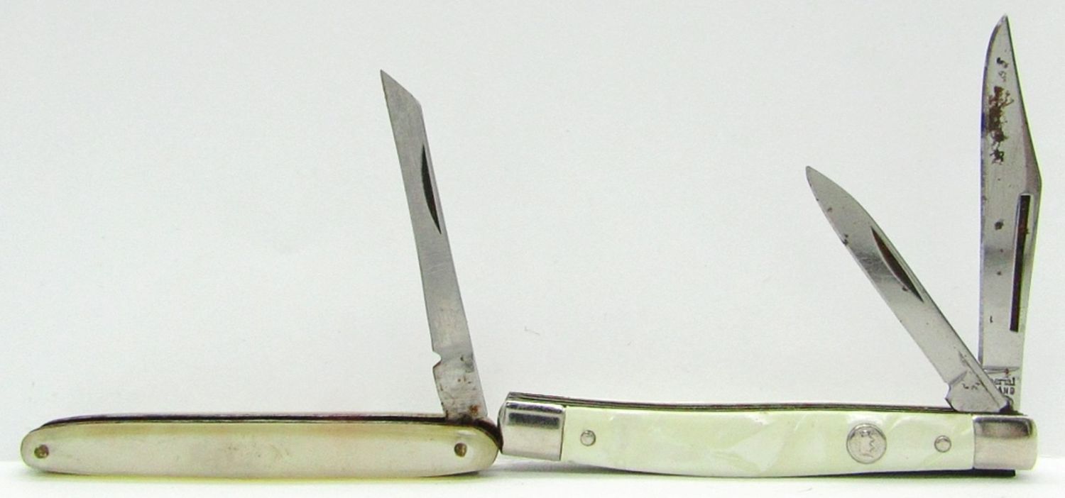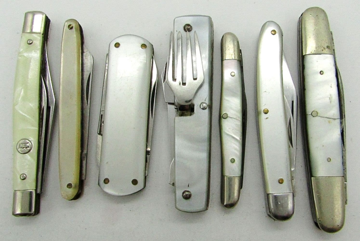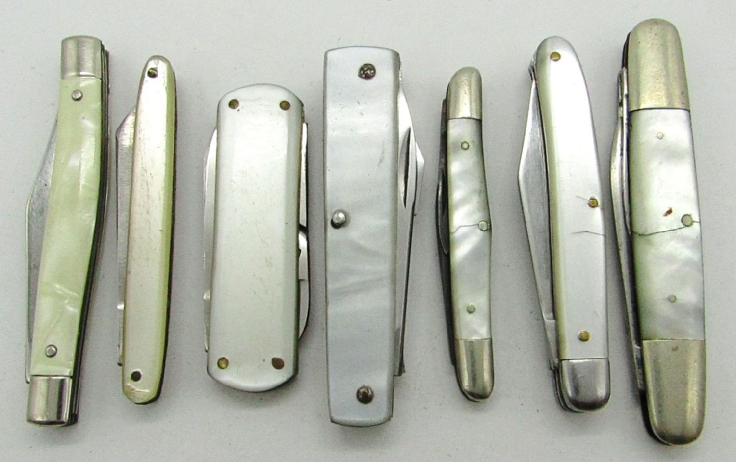 Single Blade Hobo Knife with Pearlescent Handles, 3-Blade Bostwick Braun Co. Toledo, Single Blade Stainless Japan, 2-Blade Sabre Japan 676, 2-Blade Imperial Ireland, 2-Blade Utica Cutlery Co., Multi-Tool StainlessJapan; Used Conditions.