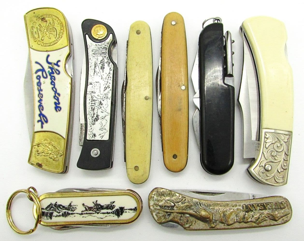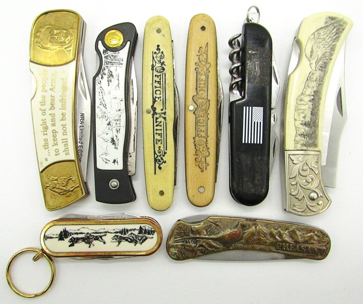 Single Blade Stainless Steel Japan, Single Blade Theodore Roosevelt NRA Limited Edition, Single Blade Stainless, Multi-Tool, 2-Blade “Office Knife” W.H. Morley & Sons Germany, 2-Blade “Office Knife” Hibbard Spencer Barlett, Single Blade Sharp “Pheasant”, Multi-Tool Stainless China; Used Conditions.