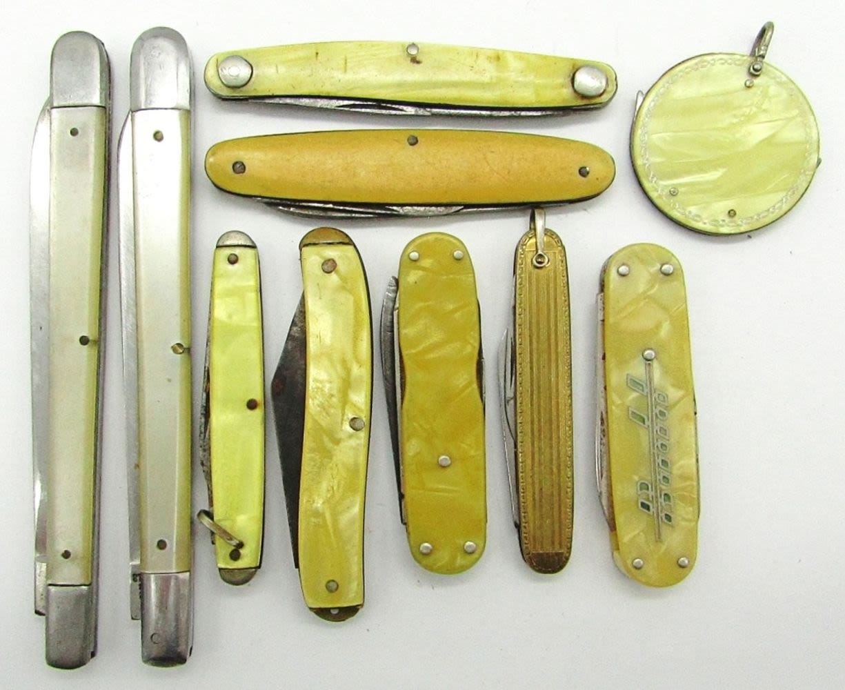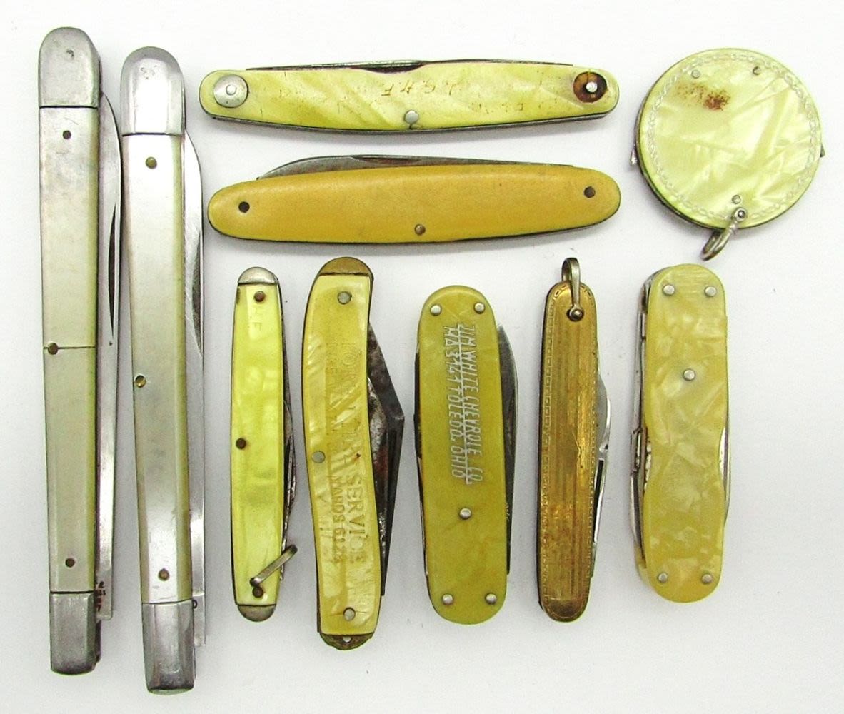 Single Blade Sabre 677, Single Blade Atco #4, 2-Blade Nashville, 2-Blade Saxon, 2-Blade Unmarked, Multi-Tool Hill Novelties (x2), 2-Blade Kent NY City, 2-Blade Hammer Brand, 2-Blade Round Usa Made; Used Conditions.