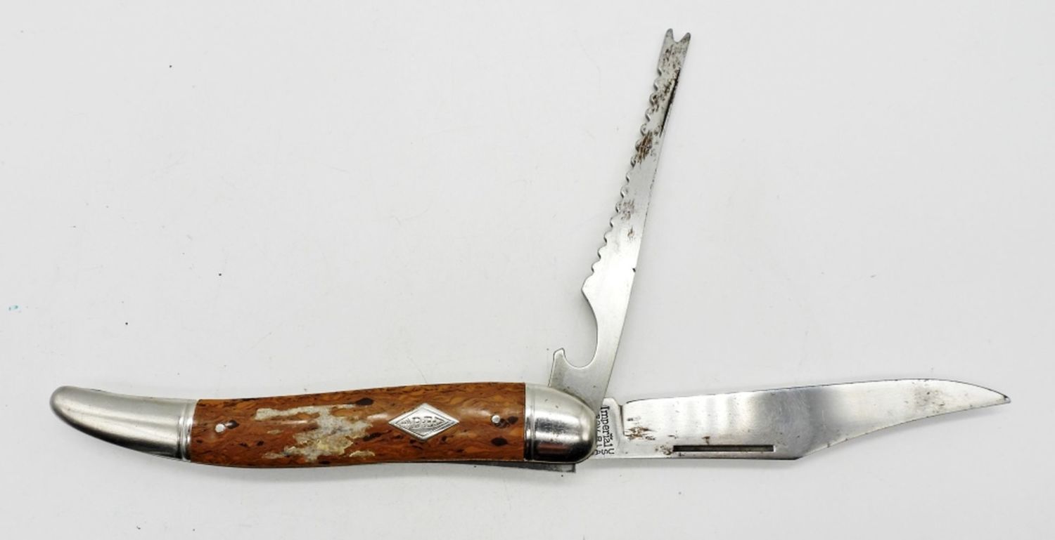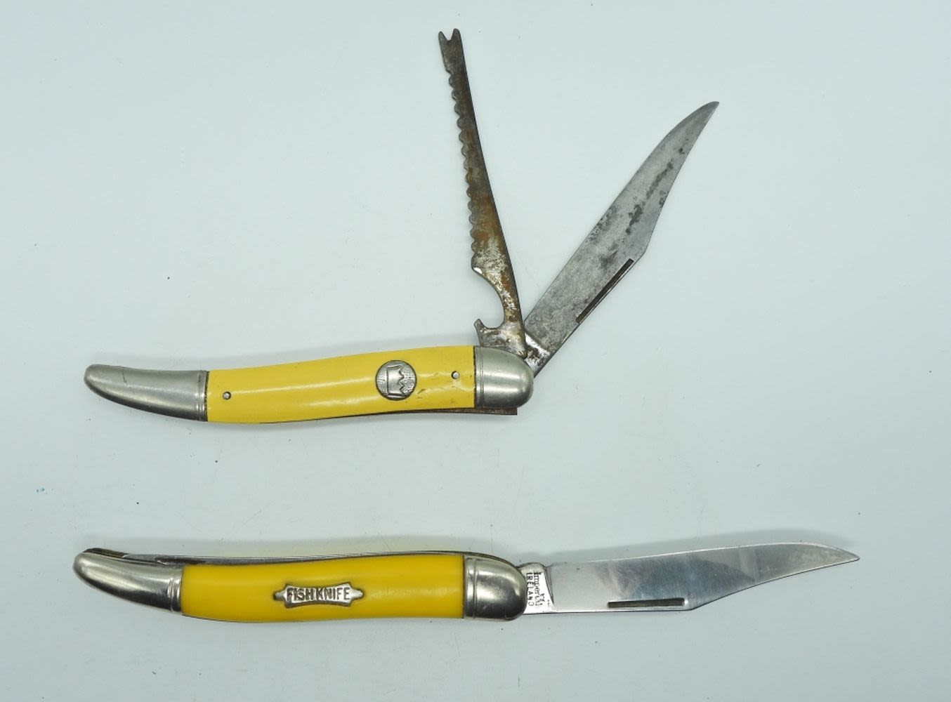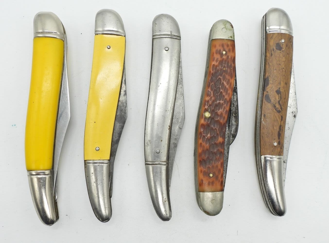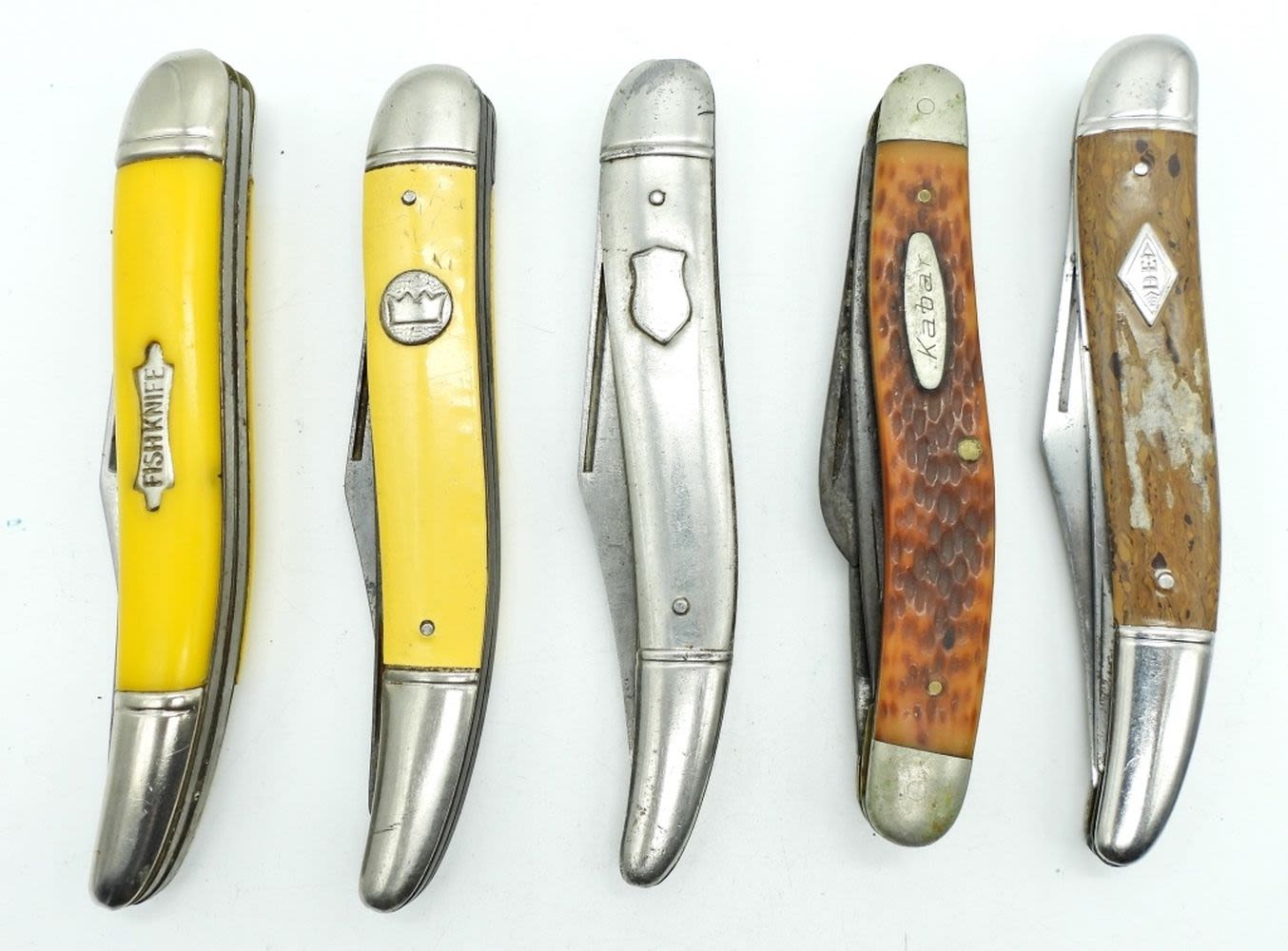 Single Blade Imperial Prov. RI USA, 2-Blade Imperial Prov. RI USA DE, 2-Blade Imperial Ireland “Fish Knife”, 2-Blade Imperial Prov. RI USA, 3-Blade Ka Bar; Used Conditions.