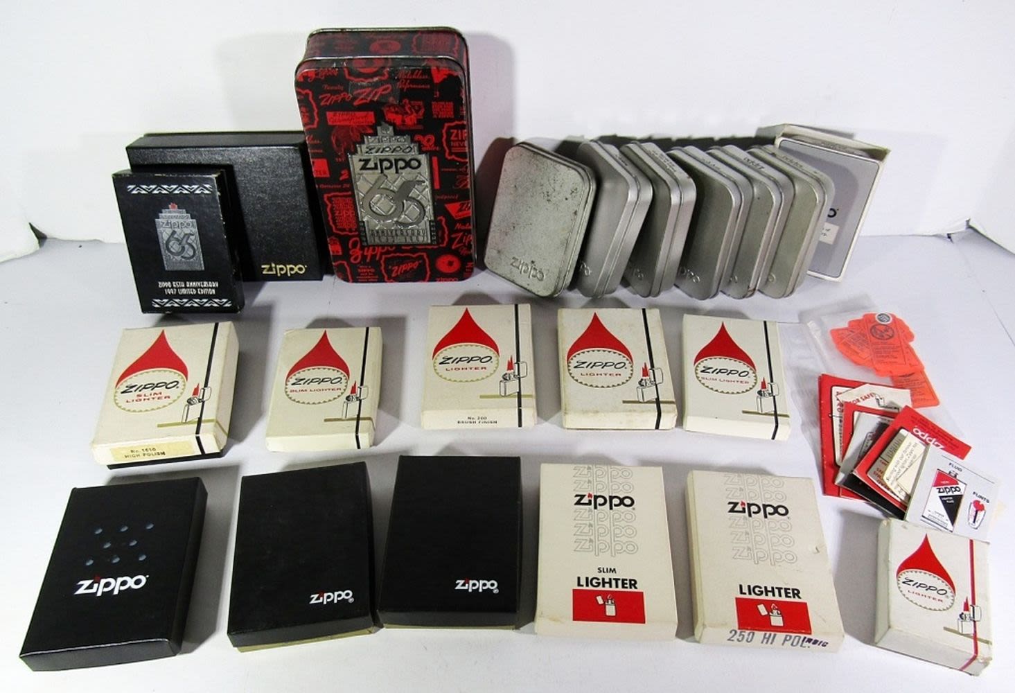 (13) BOXES, (8) TINS, & MISCELLANEOUS PAPERS AND WARNING STICKERS. INCLUDES 65TH ANNIVERSARY COMMEMORATIVE TIN & TIE TACK BOX.