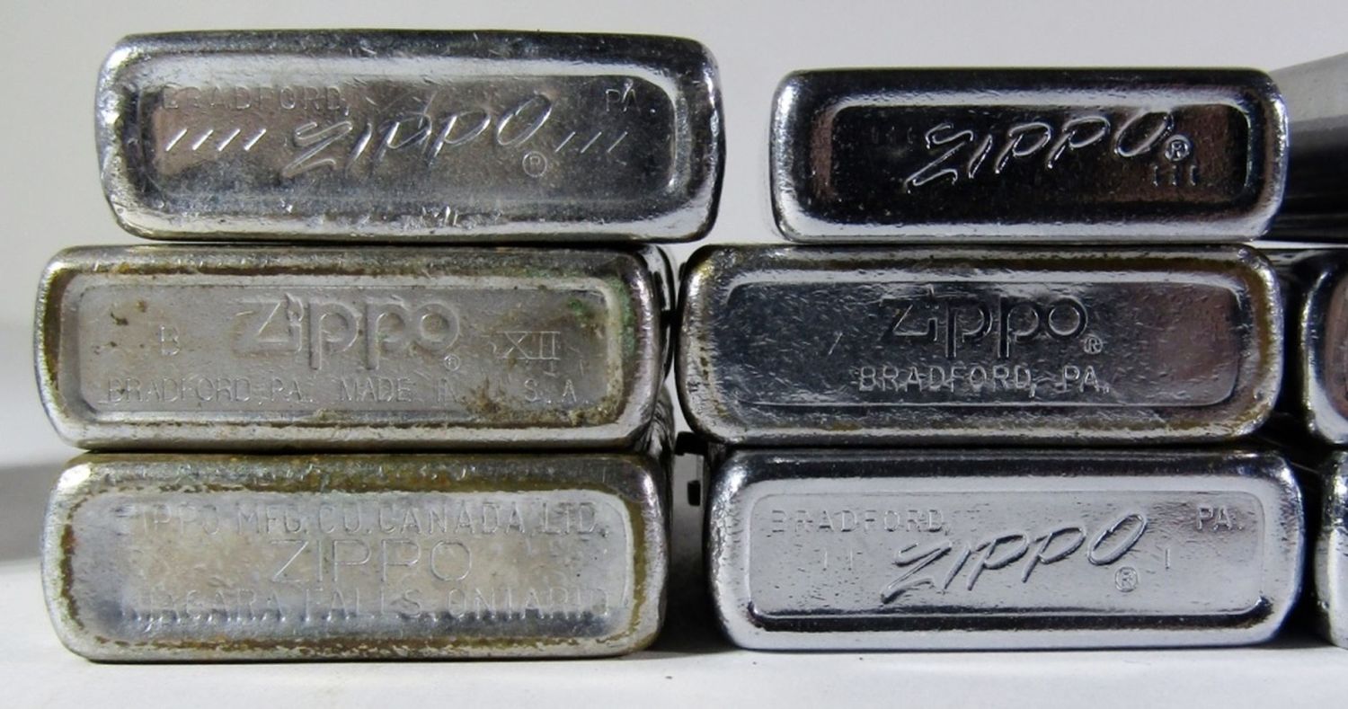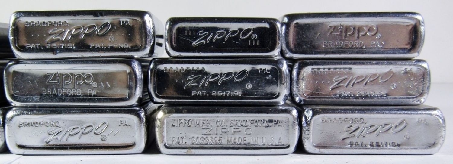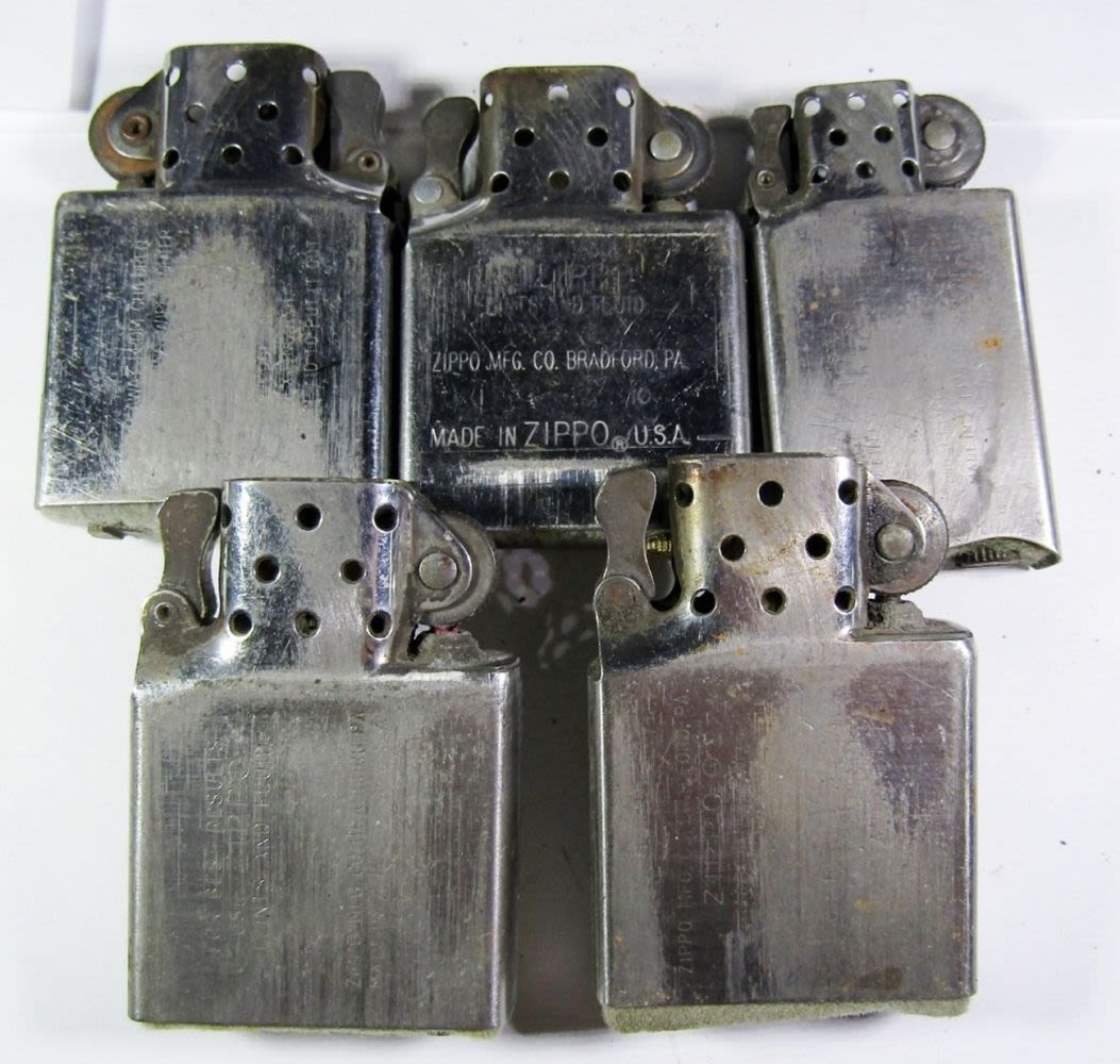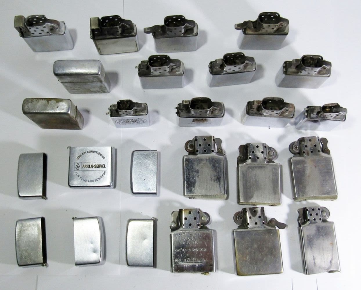 (2) RUSTED LIGHTERS, (5) LIGHTER INSERTS, (12) LIGHTERS MISSING LIDS, (5) DETACHED CASE LIDS, & (1) CASE BOTTOM. VARIOUS YEARS, DESIGNS, & CONDITIONS.