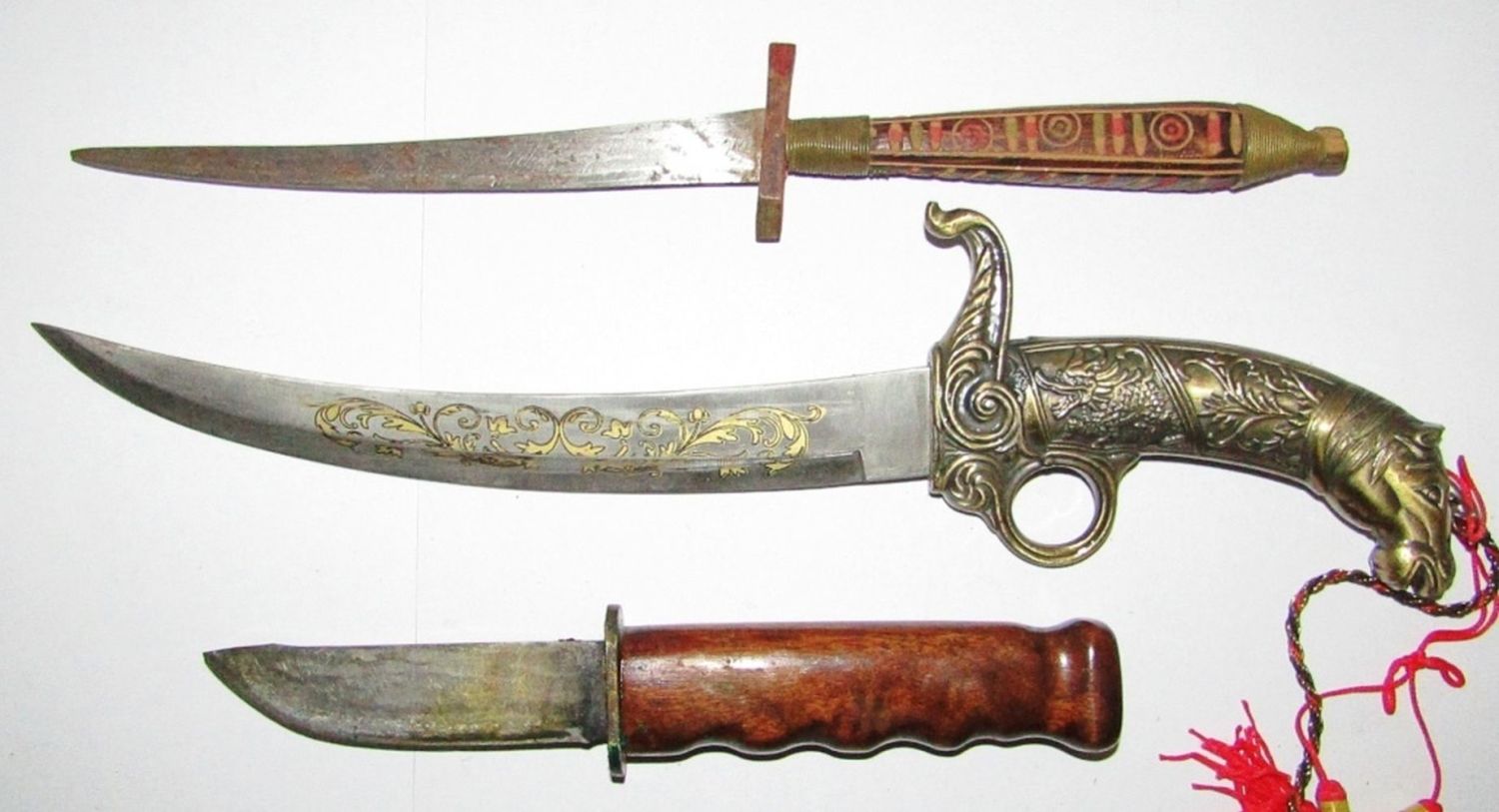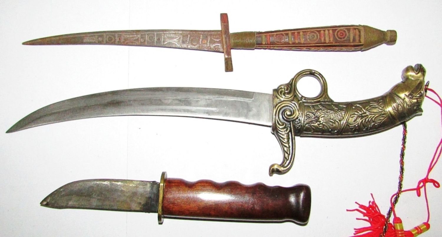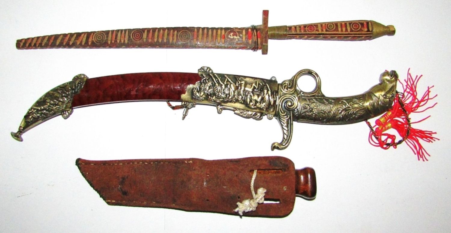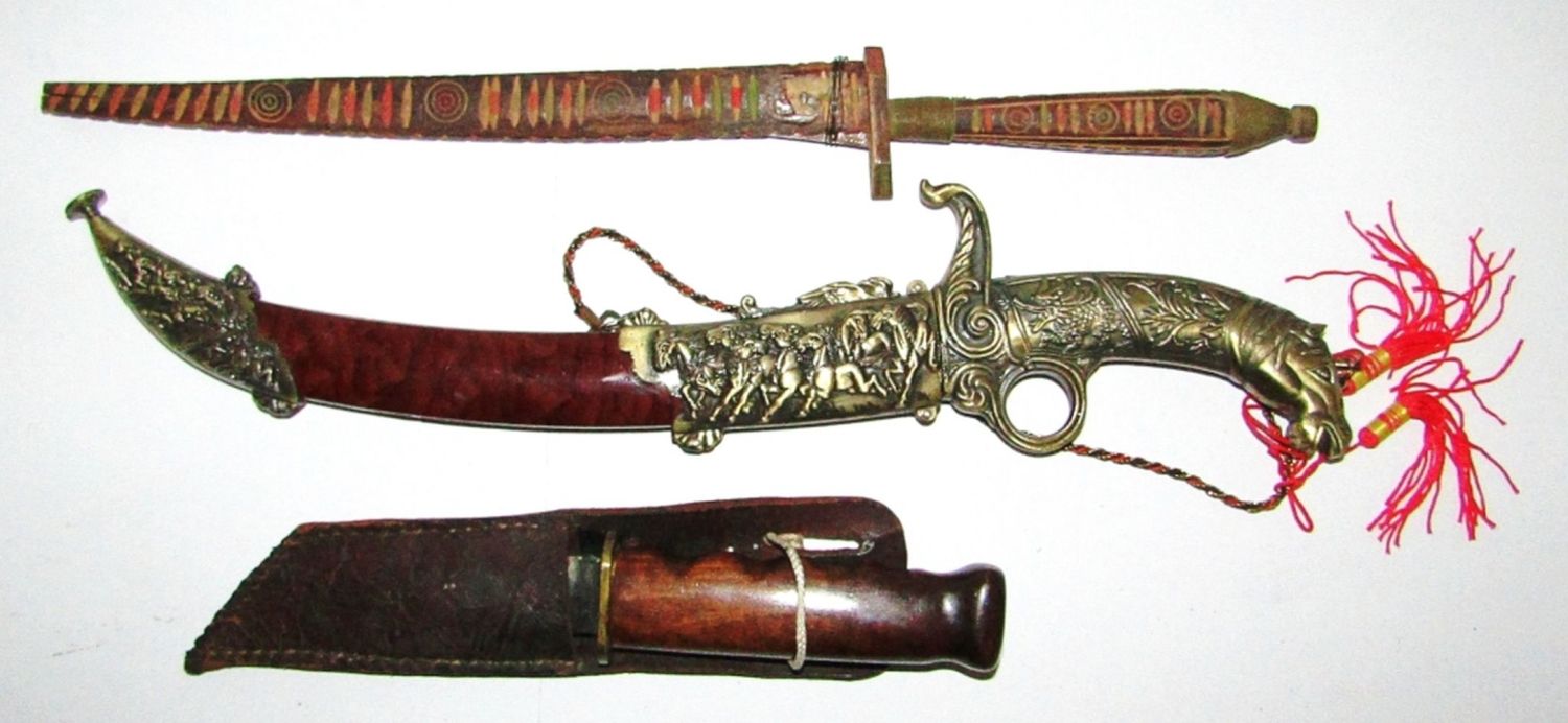 Ceremonial Curved Dagger and Decorative Scabbard, Wooden Handle & Sheath Handmade Short Sword, Handmade Short Hunting Knife; All Used Conditions.