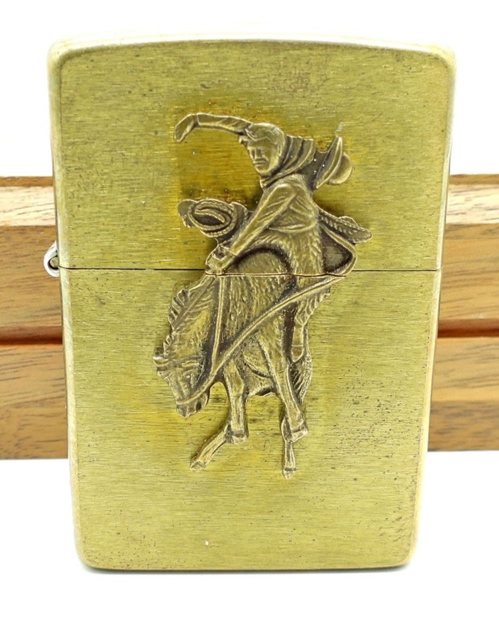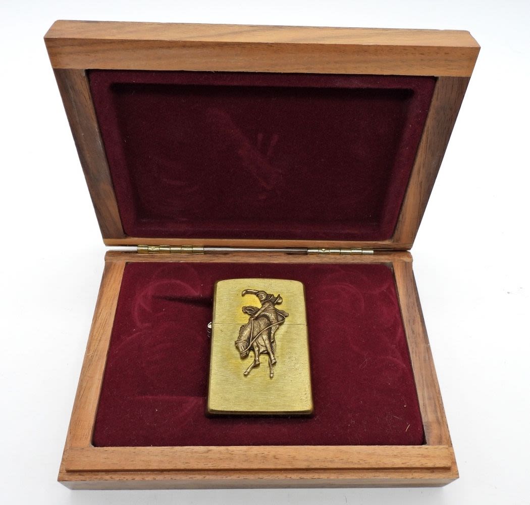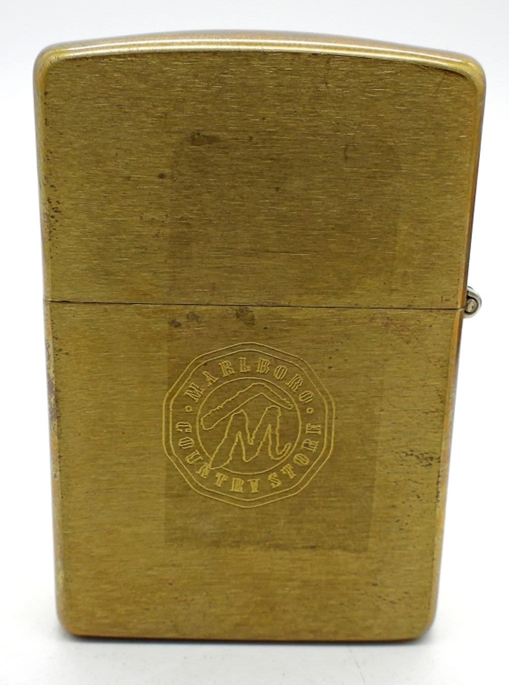 BRASS, IN WOODEN DISPLAY BOX, ETCHED MARLBORO COUNTRY STORE ON THE BACK