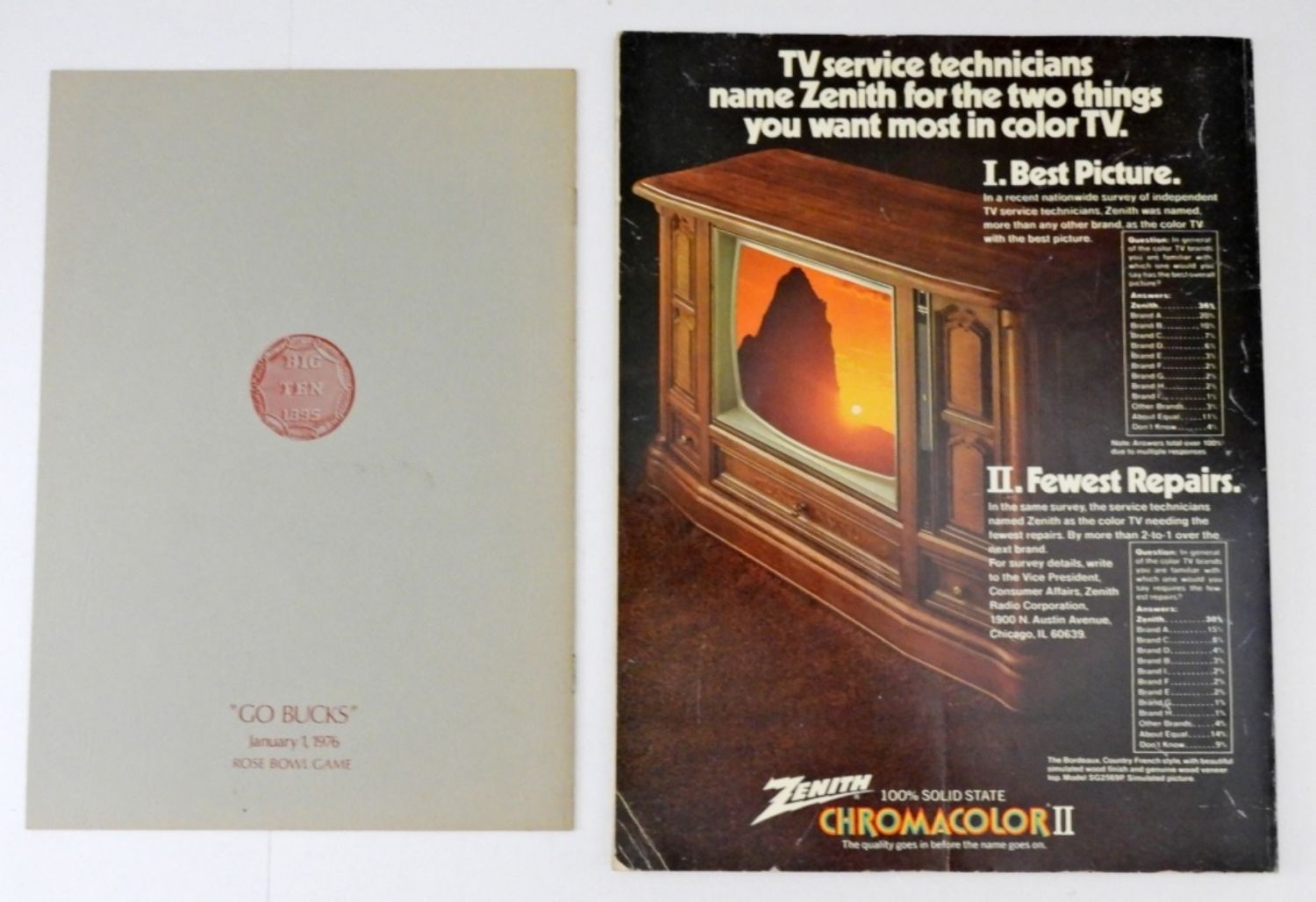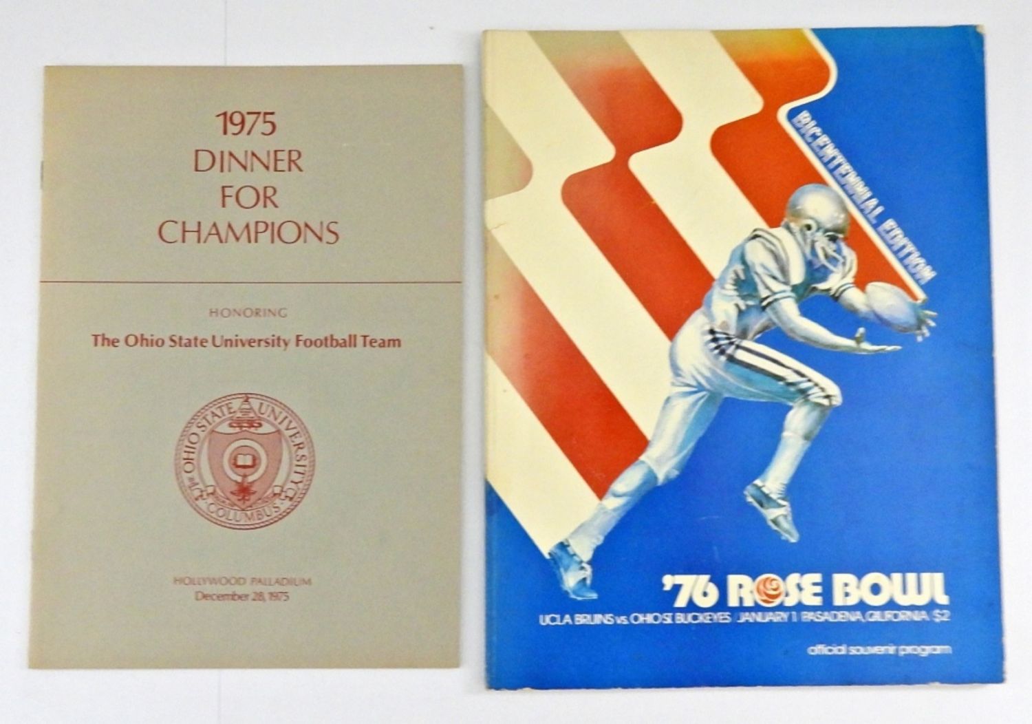 1976 ROSE BOWL FOOTBALL GAME OFFICIAL PROGRAM BOOK – BICENTENNIAL EDITION – UCLA VS OHIO STATE – IN PLASTIC SLEEVE, PLUS 1975 “DINNER FOR CHAMPIONS” PROGRAM