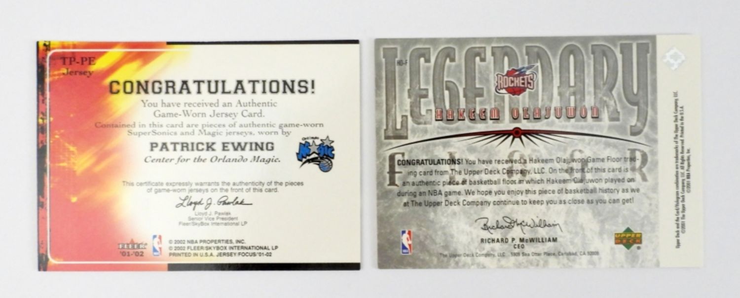 2001-02 FLEER TRADING PLACES PATRICK EWING & 2001-02 UPPER DECK LEGENDARY FLOOR HAKEEM OLAJUWON