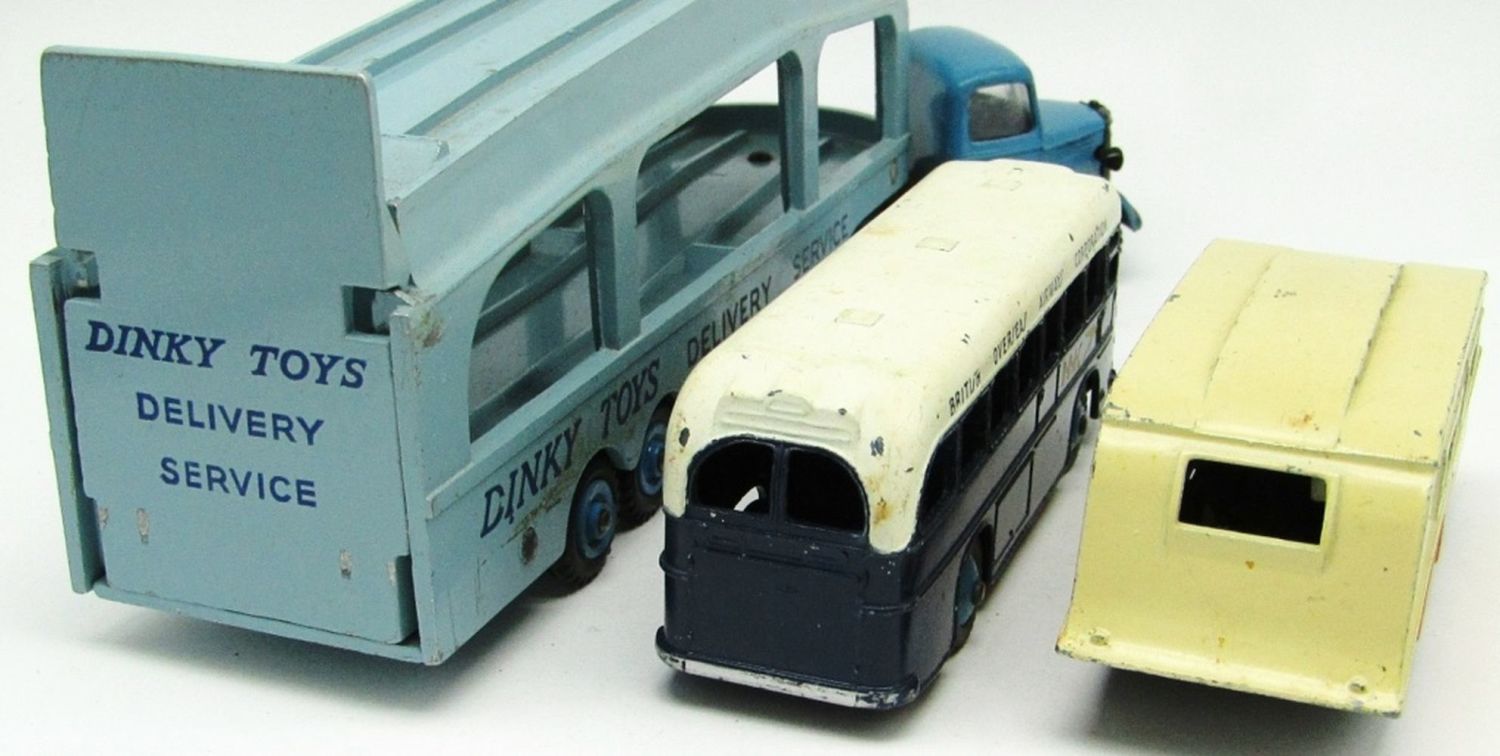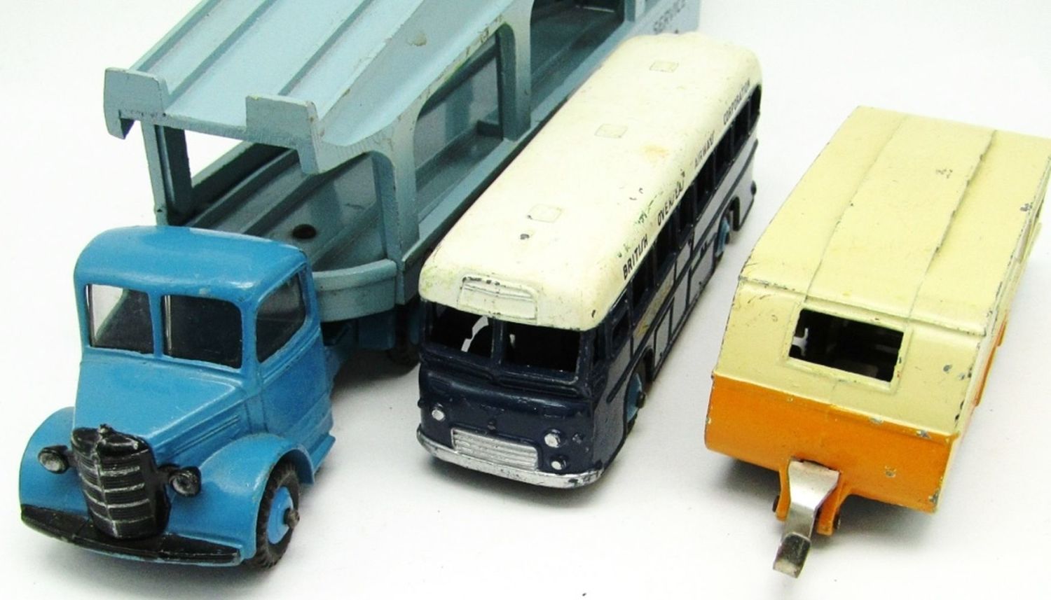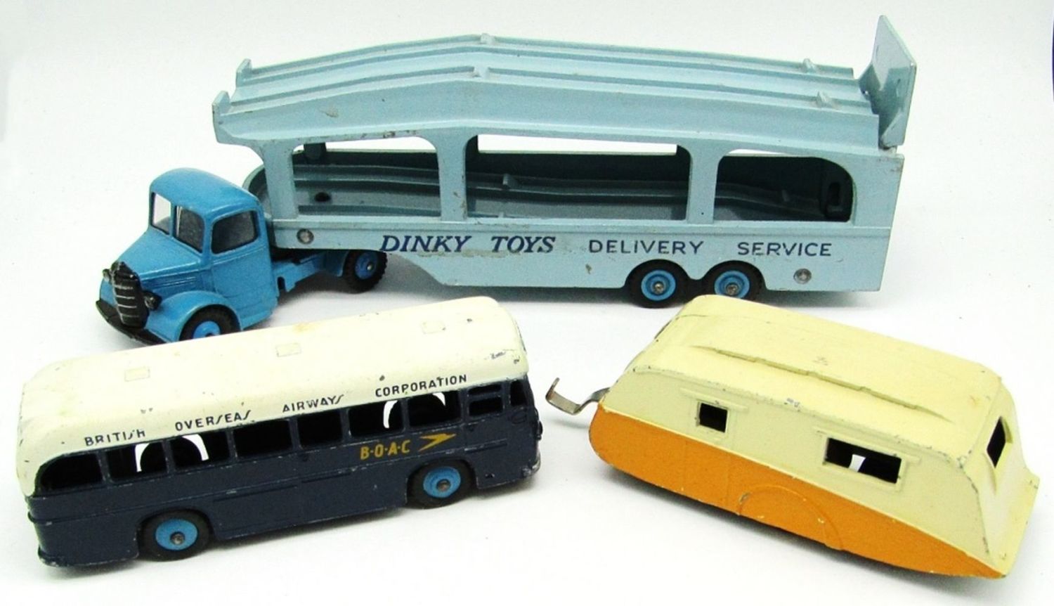 #982 Dinky Supertoy Bedford Delivery Service Pullmore Car Transporter, #283 British Overseas Airways Corporation, #190 Caravan; Used but Good Conditions!