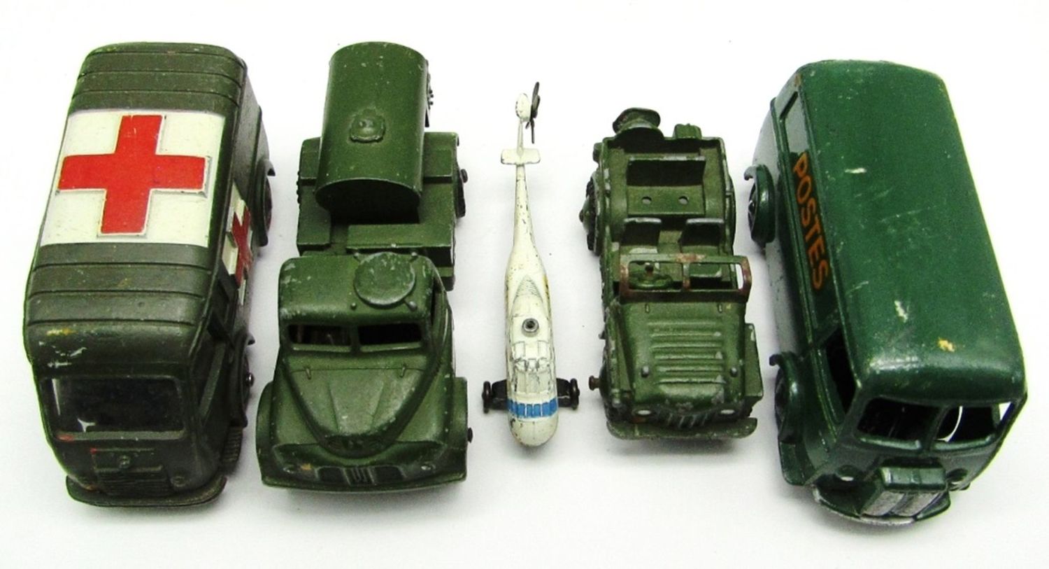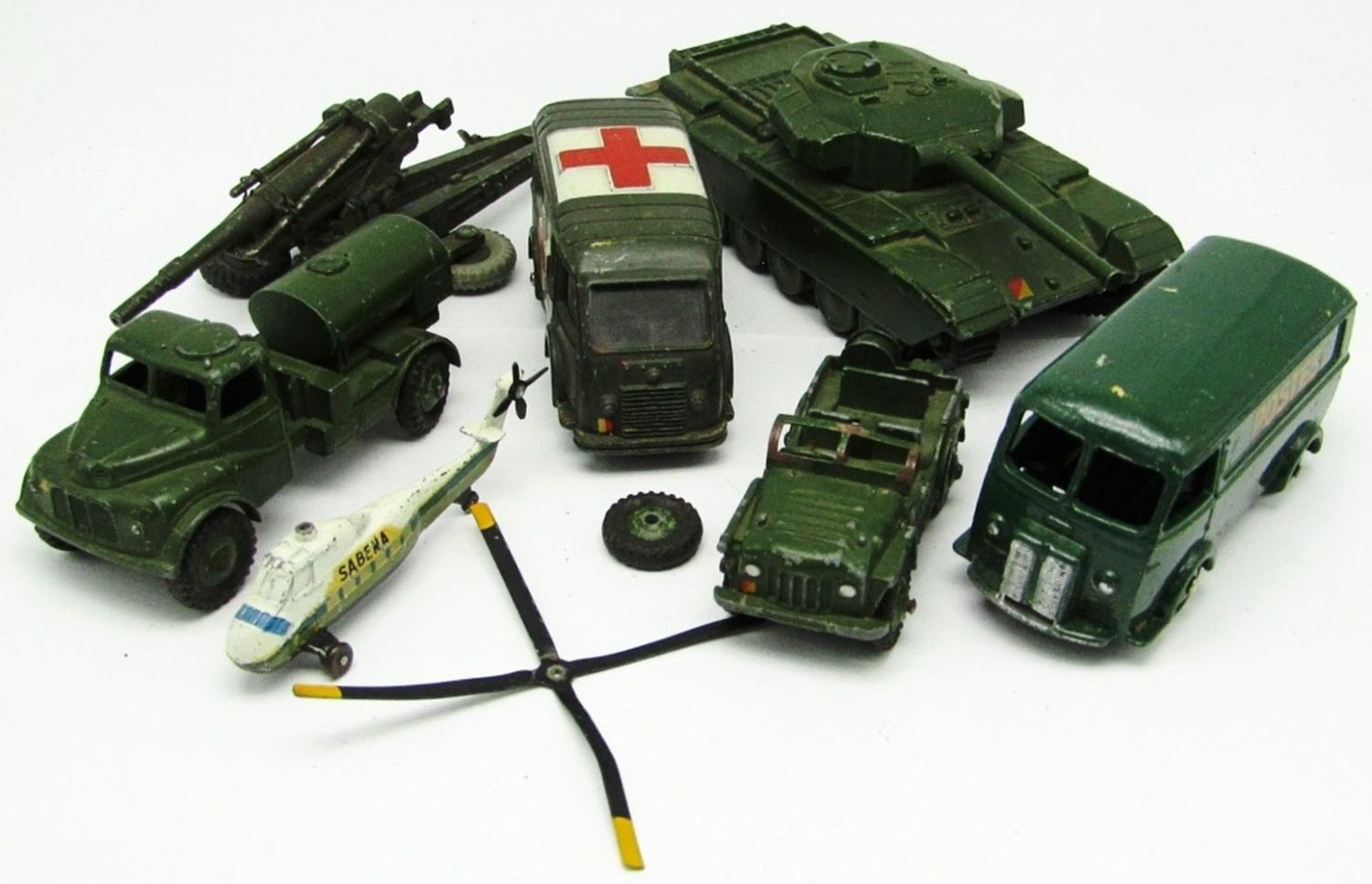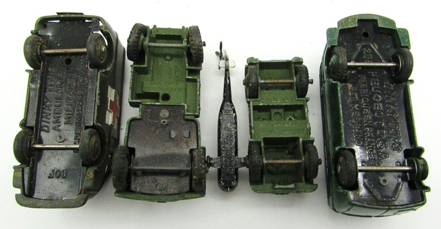 #651 Supertoys Centurion Tank, #80F Ambulance Militaire Made in France, #674 Austin Champ, #643 Army Water Tanker, #80E Obusier 155MM French Field Gun (Wheels are funky), #60D Helicopter Sikorsky S.58 Sabena France Model (Blades are Detached from Copter), Peugeot D.3.A. 258 Fabrique En France Par Meccano Postes; Used Conditions.
